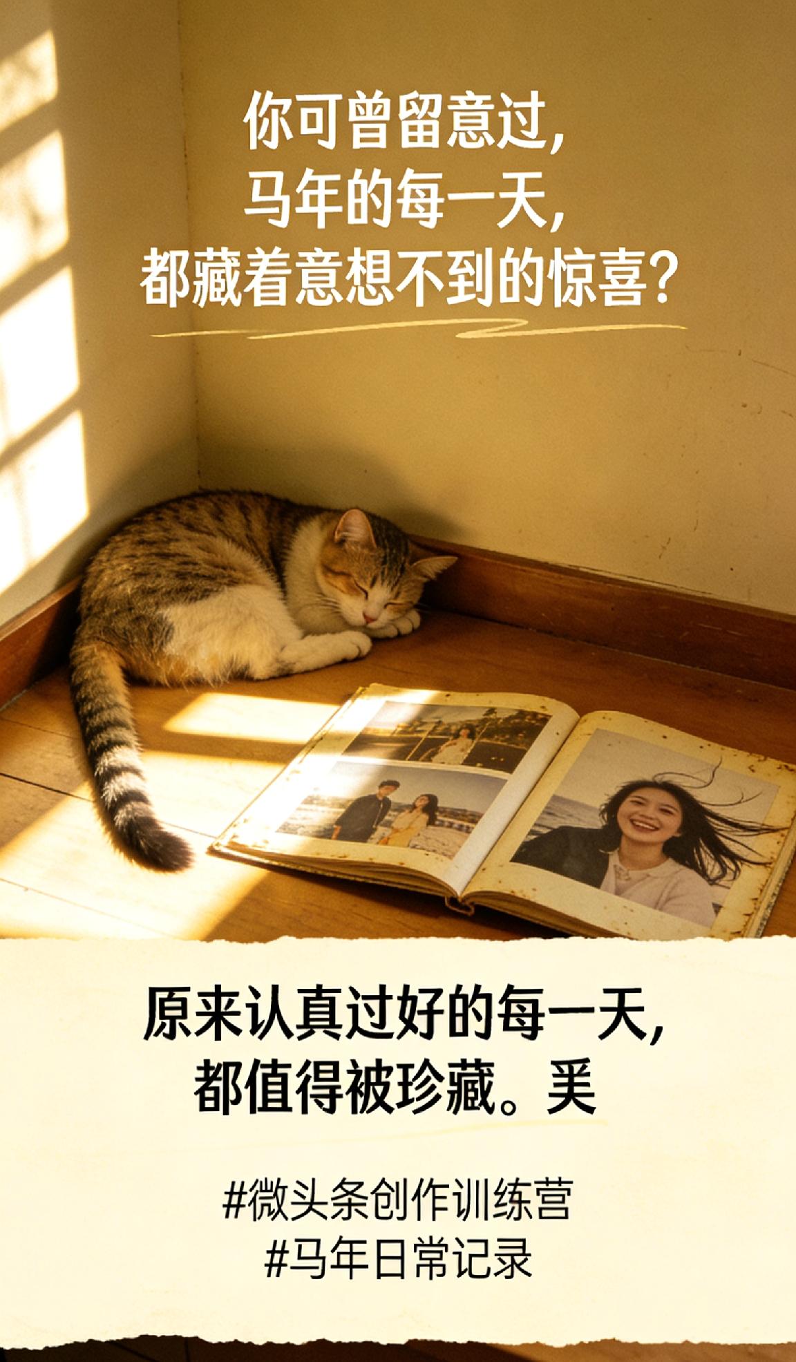 你可曾留意过,马年的每一天,都藏着意想不到的惊喜? 午后阳光斜过窗棂,在书桌上落下斑驳光影,像时光碎成了金。猫咪蜷在角落打盹,偶尔尾巴轻轻扫过地板,把寂静扫出涟漪。翻开旧相册,看到去年和朋友旅行的合照——那时笑得真肆意啊,风把头发吹乱也没人在意,笑声仿佛还在耳边回响。 原来认真过好的每一天,都值得被珍藏。🐴 马年日常记录