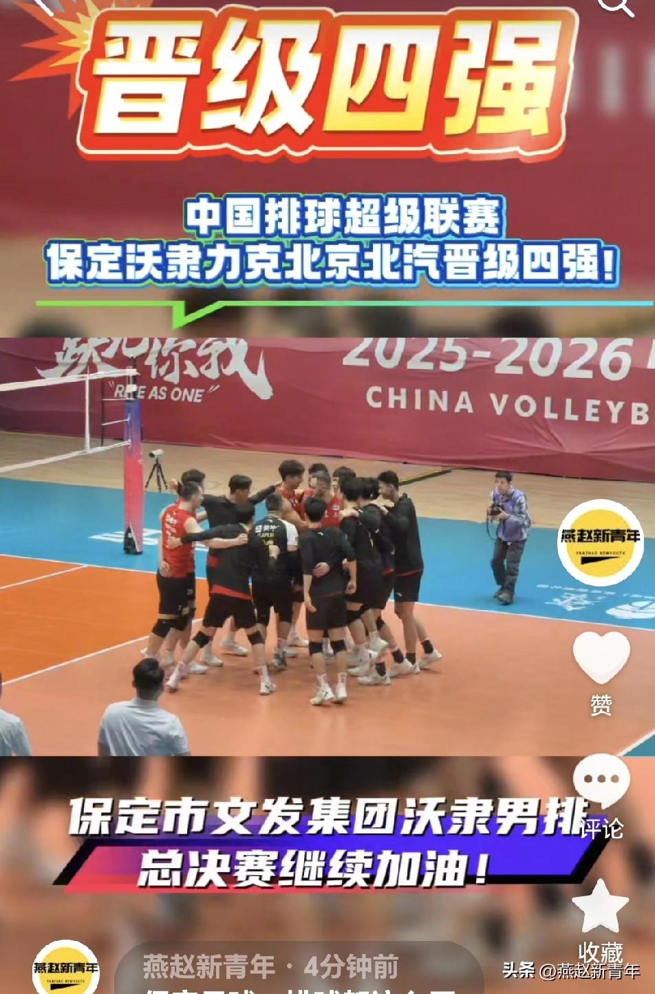保定足球、排球都这么厉害,双双晋级四强!河北五超保定队晋级4强,中国排球超级联赛保定沃隶男排力克北京北汽男排,也晋级四强!期待总决赛有更精彩表现,继续为他们加油!