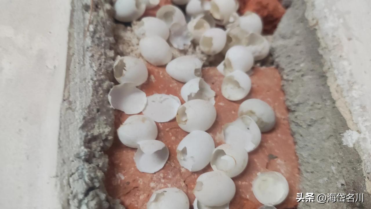 今天在临沂平邑的一个山村发现,拆掉门框,在里面发现一窝蛋壳,都粘在砖块上,是什么
