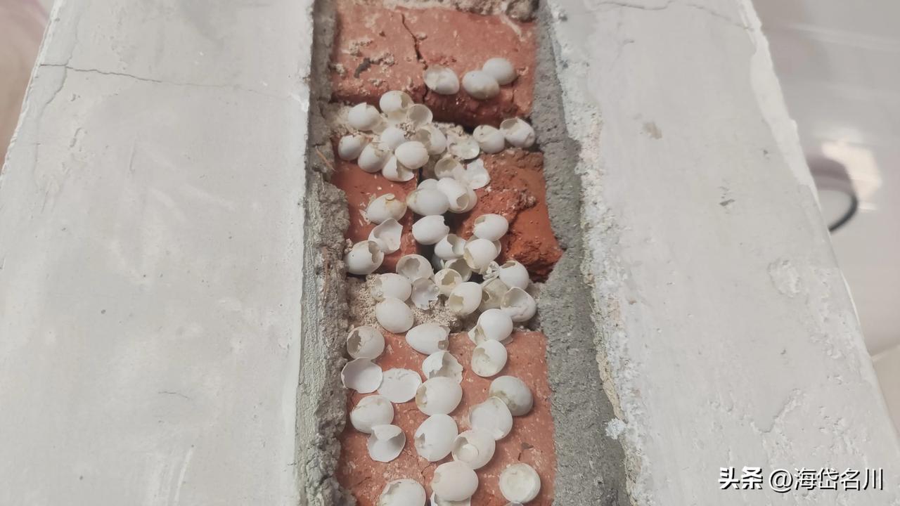 今天在临沂平邑的一个山村发现,拆掉门框,在里面发现一窝蛋壳,都粘在砖块上,是什么动物繁殖这么厉害,一窝产下这么多蛋呢?知道的评论区留言。