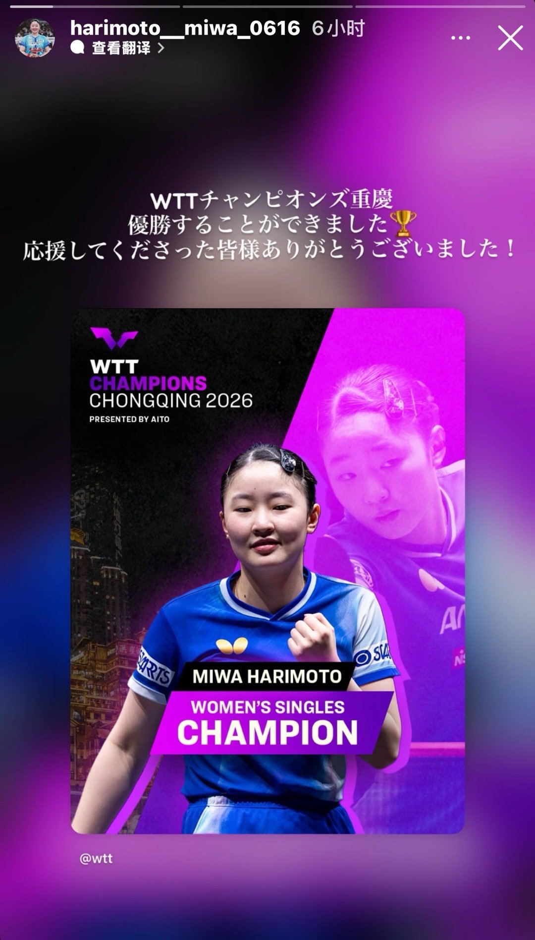 美和:我在 WTT重庆冠军赛 夺得了冠军。非常感谢一直为我加油的大家!