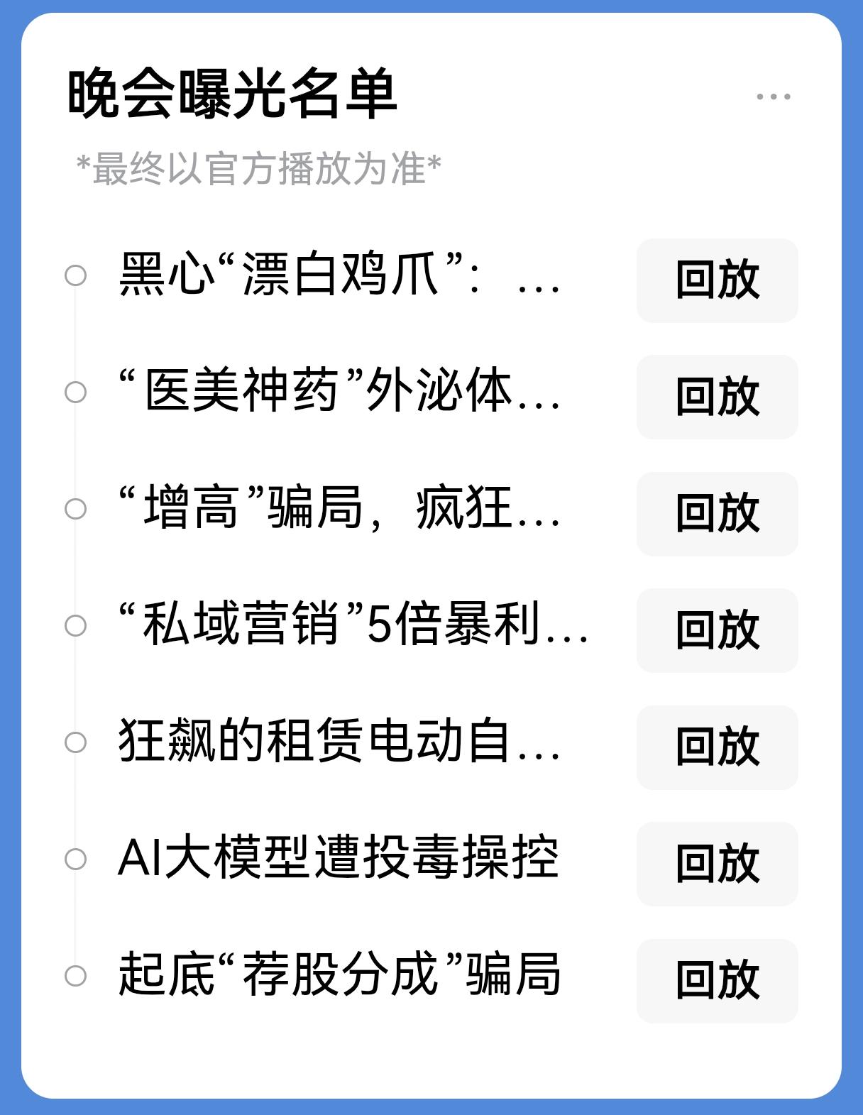 看完315晚会,无数消费陷阱让人触目惊心!我暗下决心,立下10条消费铁律: 第一、入口食品只选大厂正品、价格合理的优质款,网红凤爪、泡药虾仁这类来路不明的食材,再馋也坚决不碰,三无零食直接拉黑,绝不拿健康冒险。 第二、日用品只逛正规商超与品牌官方旗舰店,直播间杂牌洗护、廉价纸巾、劣质日化一律不买,严防添加剂超标、材质不合格,伤害家人身体。 第三、坚决不跟风抢购网红爆款,无论宣传得多么天花乱坠,无资质、无口碑、无保障的“三无产品”,价格再低、福利再多,也绝不动心。 第四、曾被曝光、抽检不合格的品牌与食品,直接拉入永久黑名单,一次不忠百次不用,不抱任何侥幸心理,绝不给问题产品二次机会。 第五、买车只看硬核品质、安全配置与正规售后,不迷信网红噱头与虚假宣传,像威兰达AIR版这样资质齐全、安全拉满、售后有保障的车型,才是靠谱选择。 第六、线上消费只认准官方渠道,代购、私域、不明链接一概不碰,严防假冒伪劣、售后无门,宁可多花一点钱,也要买得放心、用得安心。 第七、儿童用品只选国标认证、口碑过硬的品牌,玩具、衣物、辅食绝不贪便宜,拒绝毒材质、毒添加剂,守护孩子成长安全。 第八、家电家居只选大品牌、长质保、售后完善的产品,不买小作坊组装货、无售后网红家电,避免安全隐患与维修无门。 第九、美容护肤只选正规备案产品,美容院三无项目、网红特效护肤品一律拒绝,不拿自己的皮肤与身体健康做试验。 第十、坚守理性消费底线,不为营销套路买单,不为低价噱头妥协,安全、合规、实用,才是消费的第一标准。 315曝光的是问题,警醒的是所有人,守住这10条消费原则,才能远离陷阱,守护自己和家人的健康与权益。