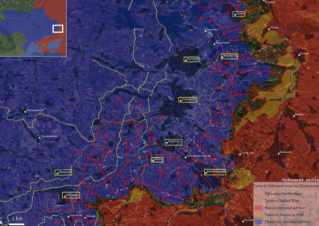 随着春天的脚步渐近,俄军🇷🇺预计将开始期待已久的斯拉维扬斯克-克拉马托尔斯克战役。几个月来,俄军在锡韦尔斯克附近已展开攻势,并在斯拉维扬斯克一线取得了初步进展。在南部,俄军仍然难以进入科斯蒂安蒂尼夫卡,也尚未能威胁到通往该要塞的后勤路线。我预计主战将很快在这条轴线上打响,尤其是在多布罗皮拉(该地也可被攻占,但需要时间)和德鲁伊基夫卡之间。俄军的主要目标是攻占赖斯克,这将威胁到科斯蒂安蒂尼夫卡的后方。与此同时,我预计在莱曼及其周边地区的进攻行动将威胁到伊久姆-斯拉维扬斯克公路。俄军将面临乌克兰军队的顽强抵抗,乌克兰军队将利用地形优势、新建的防御工事以及城镇的规模来阻止俄军的推进。俄军的主要目标是夺取西线城市东西两侧的战术制高点,特别是切断通往该区域的三条主要道路(伊久姆、巴尔文科夫和多布罗皮拉)。这张地图是我对俄军未来6至12个月计划/预期的理解。俄军可能还会在奥里希夫前线、波克罗夫斯克附近以及奥斯基尔方向发起进攻。