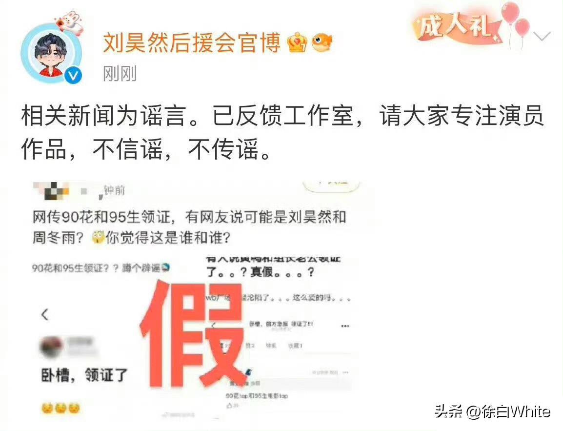 3月16日,周冬雨刘昊然,比官宣复合来的更快的是,刘昊然后援会的否认! 今天一大早就有消息称内娱90花跟95生复合,好事将近,不少网友猜测是周冬雨刘昊然,甚至开始期待他们的官宣,没想到等来的是刘昊然后援会的否认,图片里的内容只有领证信息,没有复合信息,要知道原本两个消息是放在一起的,所以……复合或许,可能是真的,领证可能没那么快! 不管怎么说,不摁头,有好消息就祝福,没好消息也不催~
