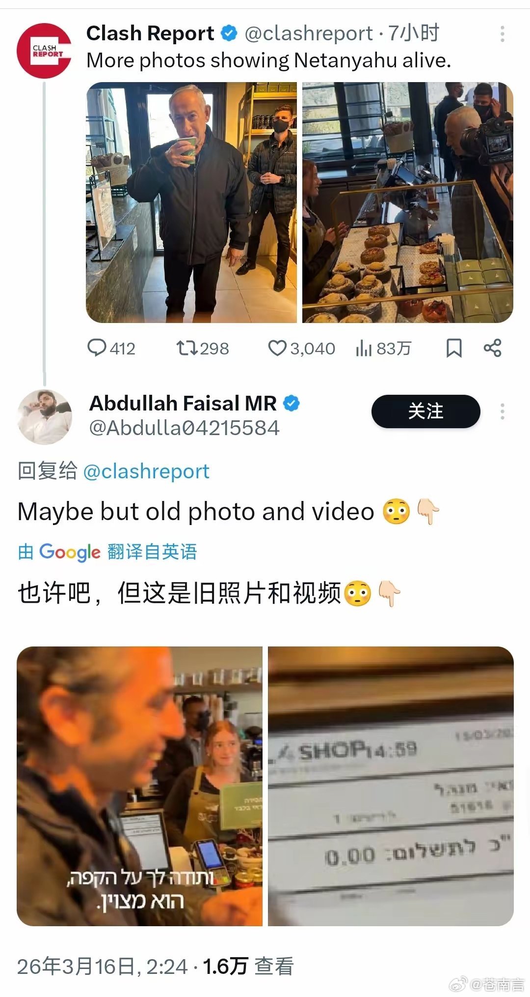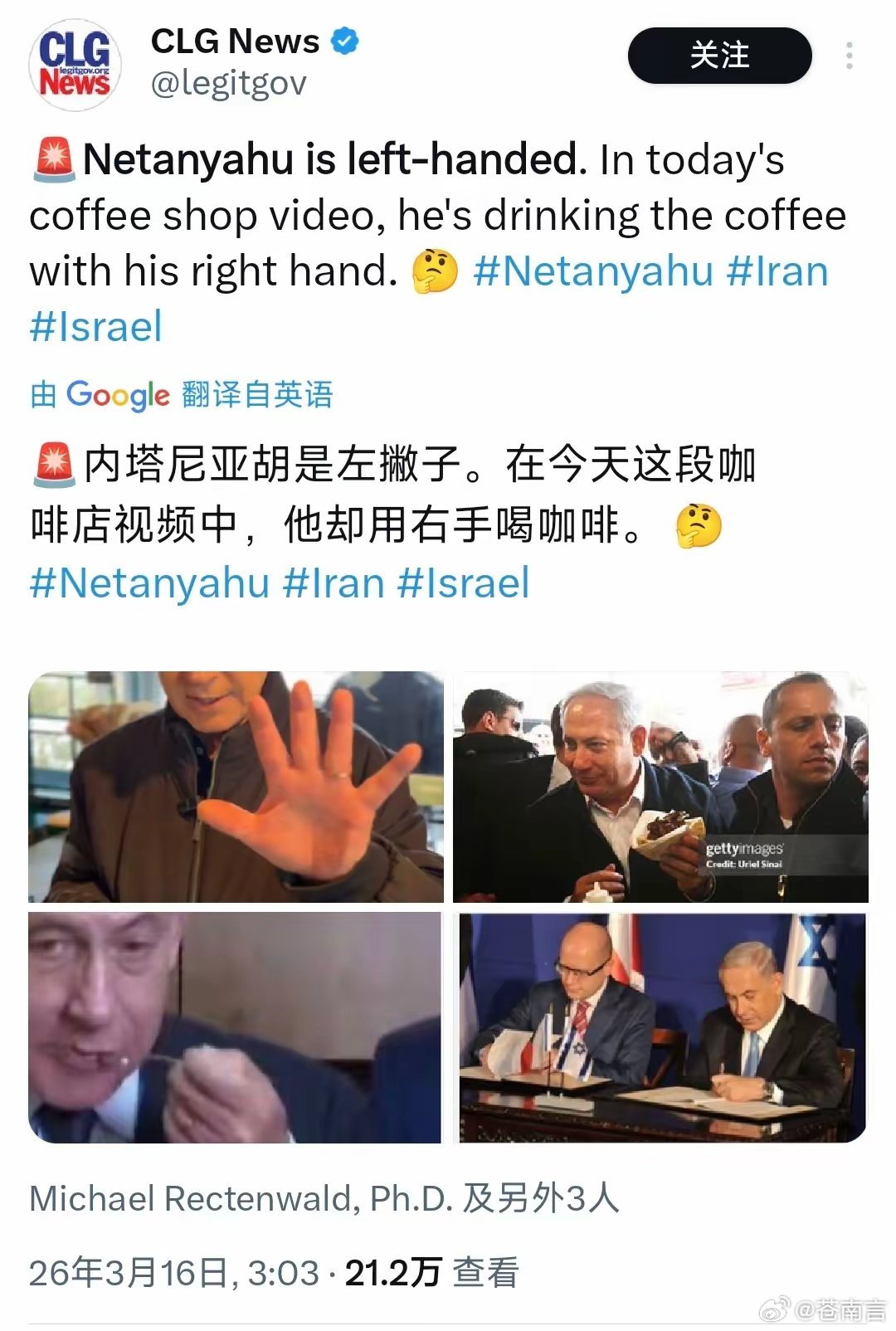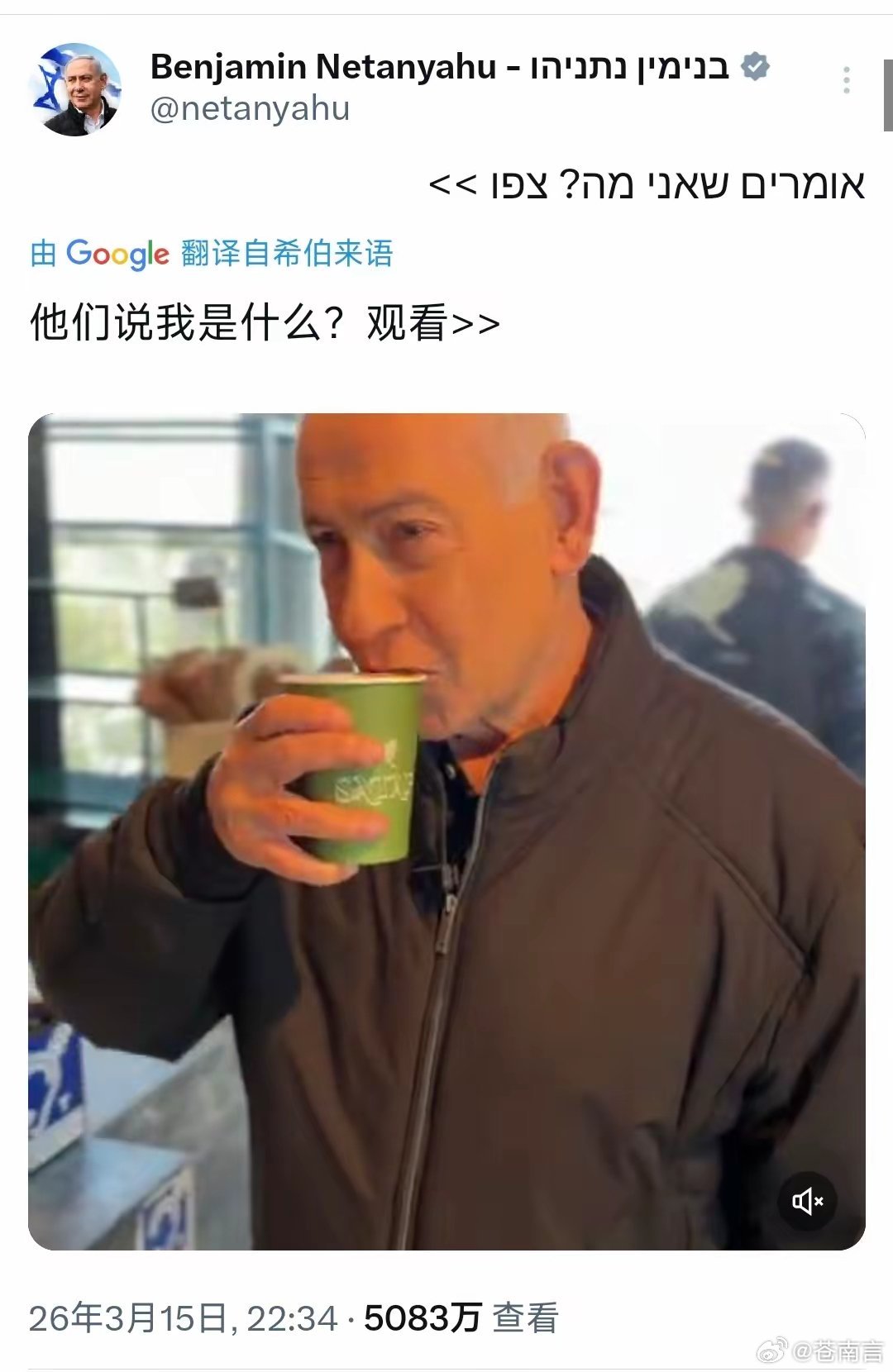 内塔尼亚胡发视频自证在世。有网民写道:“耶路撒冷唯一一家名为Sataf的咖啡馆在伊朗空袭后关闭了。所以真正的谜团是:内塔尼亚胡究竟在特拉维夫的哪个地方喝到了这杯传说中的咖啡?”也有网民指出:“内塔尼亚胡是左撇子。在这段咖啡店视频中,他却用右手喝咖啡。”