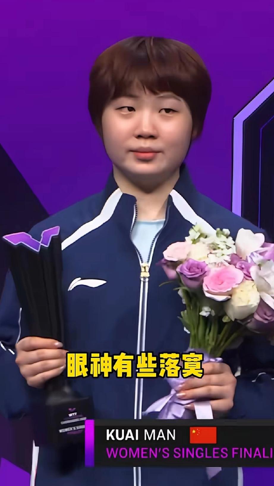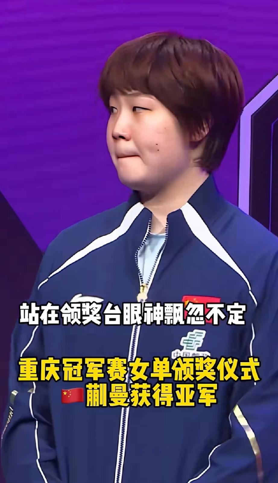 蒯曼夺得重庆冠军赛女单亚军。领奖台上有点落寞! 登上领奖台的蒯曼,左右看看抿着嘴,有点无措,眼神飘忽不定。即便手里抱着奖杯也有淡淡的忧伤。输给国内选手,也不会那么落寞。虽然得到亚军,成绩也很好了,但是国乒, 打完内战不是重点,战胜外协才是。蒯曼应该也体会到了姐姐们的压力和责任吧,这也算是一种成长。 这也是蒯曼成为四号种子选手最好的一次机会,回去好好复盘比赛,大丫头继续努力吧。