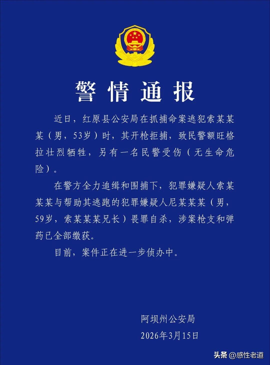他把生命和鲜血洒在高原——37岁民警额旺格拉抓捕嫌疑人壮烈牺牲。 他用12年从警生涯的坚守与最后一刻的无畏,在高原大地上书写下“人民公安为人民”的壮丽篇章,将生命与鲜血献给了这片养育他的土地。 从警12年,额旺格拉始终冲锋在基层警务一线,在平凡岗位上做出了不平凡的业绩,用行动诠释着人民警察的使命与担当。 2026年2月,红原县公安局接到线索,命案逃犯索某某某藏匿于辖区内。索某某某53岁,身负命案,且极有可能携带武器,极度危险 。面对这一重大抓捕任务,额旺格拉没有丝毫犹豫,主动请缨,要求参与抓捕行动。他深知,这是一场生死考验,但他更清楚,作为人民警察,守护群众安全、将罪犯绳之以法是义不容辞的责任 。 抓捕行动当天,高原的风依旧凛冽,草原上能见度不高,给抓捕工作带来了极大困难。额旺格拉与同事们密切配合,按照既定方案展开搜捕,一步步逼近嫌疑人藏匿地点。当嫌疑人索某某某发现被包围后,竟丧心病狂地掏出枪支,开枪拒捕。 危急时刻,额旺格拉没有退缩。他不顾个人安危,第一时间冲在前面,与同事们共同控制嫌疑人,保护周围群众安全。子弹呼啸而过,他不幸中弹,壮烈牺牲,用生命完成了最后的守护 。在警方全力追缉和围捕下,犯罪嫌疑人索某某某及其帮助其逃跑的兄长尼某某某畏罪自杀,涉案枪支和弹药被全部缴获,避免了更多危险发生 。 37岁的额旺格拉,用生命践行了“对党忠诚、服务人民、执法公正、纪律严明”的总要求,用鲜血染红了这片他深爱的草原,也用生命守护了高原群众的平安 。