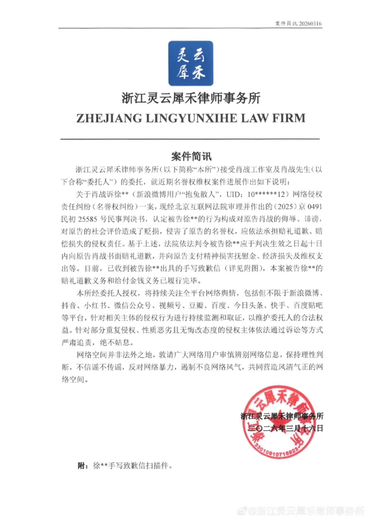 肖战工作室干的漂亮[赞][赞][赞] 肖战告黑维权,从来不搞虚的,都是直接告[赞][赞][赞] 这个道歉声明的字符合我对单卖盲子粉的刻板印象