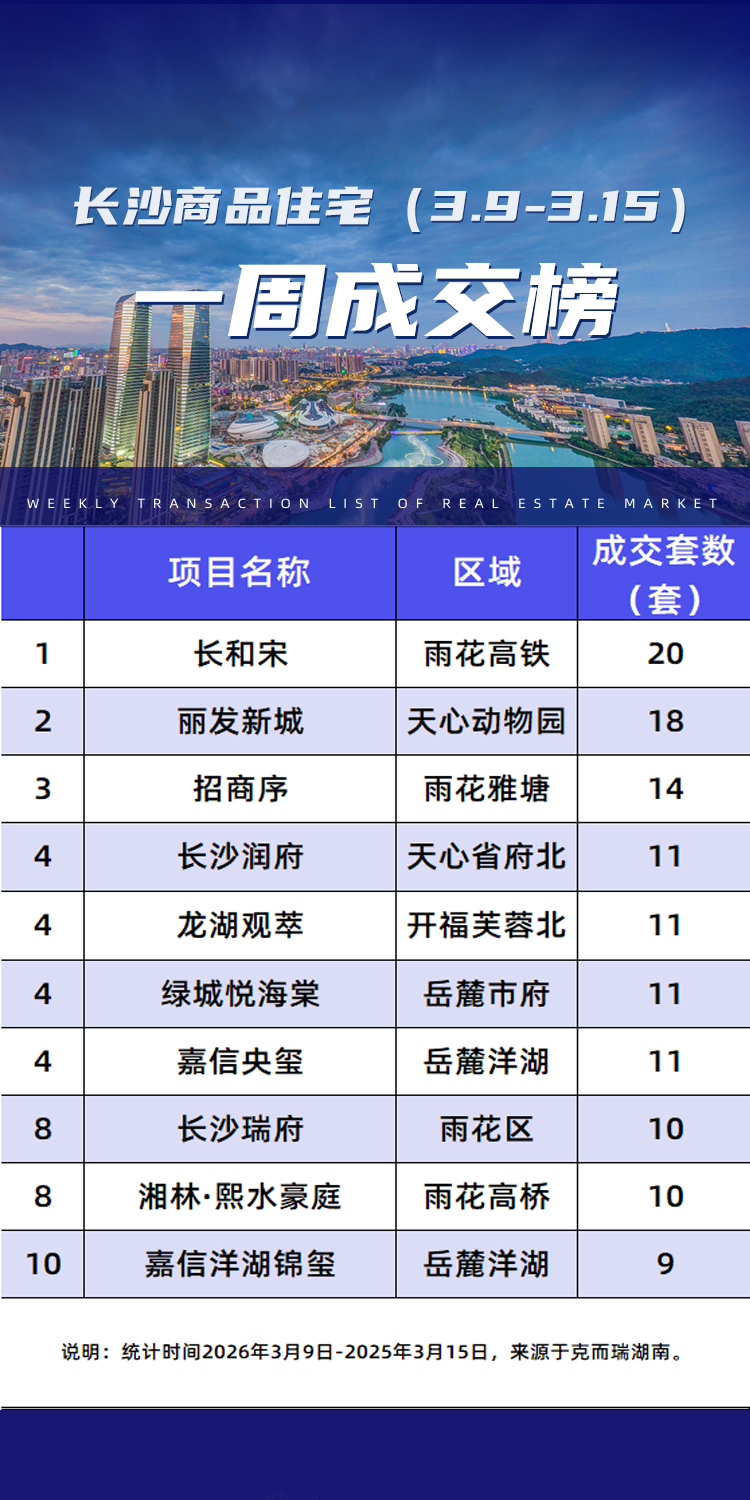其中位于榜单前三位的分别为:雨花区高铁板块的的长和宋、天心区动物园板块的丽发新城、以及雨花区雅塘板块的招商序,分别成交20套、18套、14套。