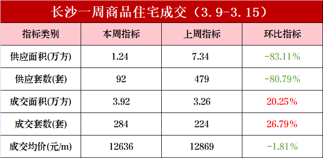新房市场方面,上周(3.9-3.15)长沙内五区(含高新区、长沙县托管区域)一手住宅成交284套、3.92万方,成交均价12636元/㎡。供应上,一手住宅本周新增92套、1.24万方。