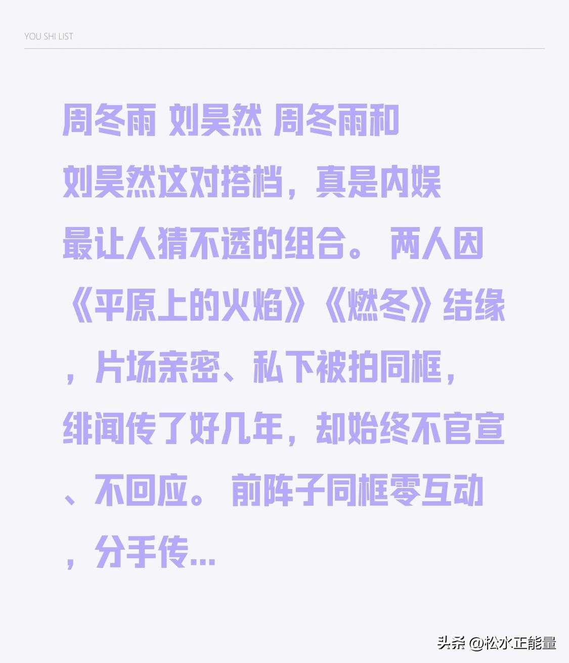 周冬雨 刘昊然 周冬雨和刘昊然这对搭档,真是内娱最让人猜不透的组合。 两人因《平原上的火焰》《燃冬》结缘,片场亲密、私下被拍同框,绯闻传了好几年,却始终不官宣、不回应。 前阵子同框零互动,分手传闻闹得沸沸扬扬,没多久又被曝私下互相支持,剧情反复反转。 作为实力派,他俩专注拍戏、低调避嫌,不炒CP也不闹难看,戏里默契拉满,戏外界限分明。不管关系如何,期待两人带来更多好作品就对了。