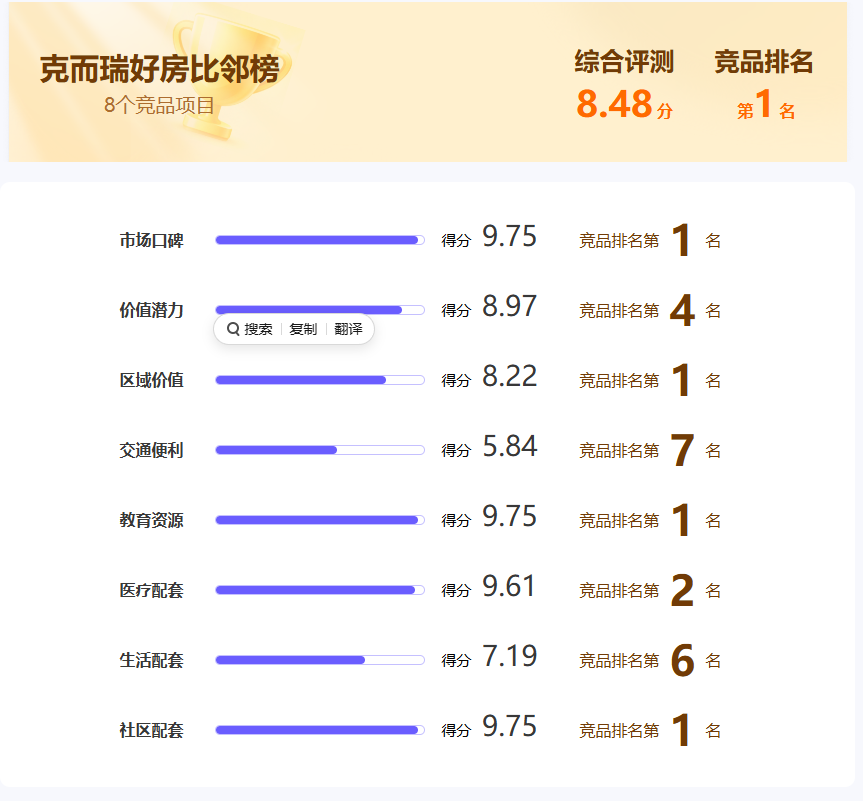 项目凭借市场口碑、区域价值、教育资源和社区配套等维度的优异表现,显著提升了整体价值。