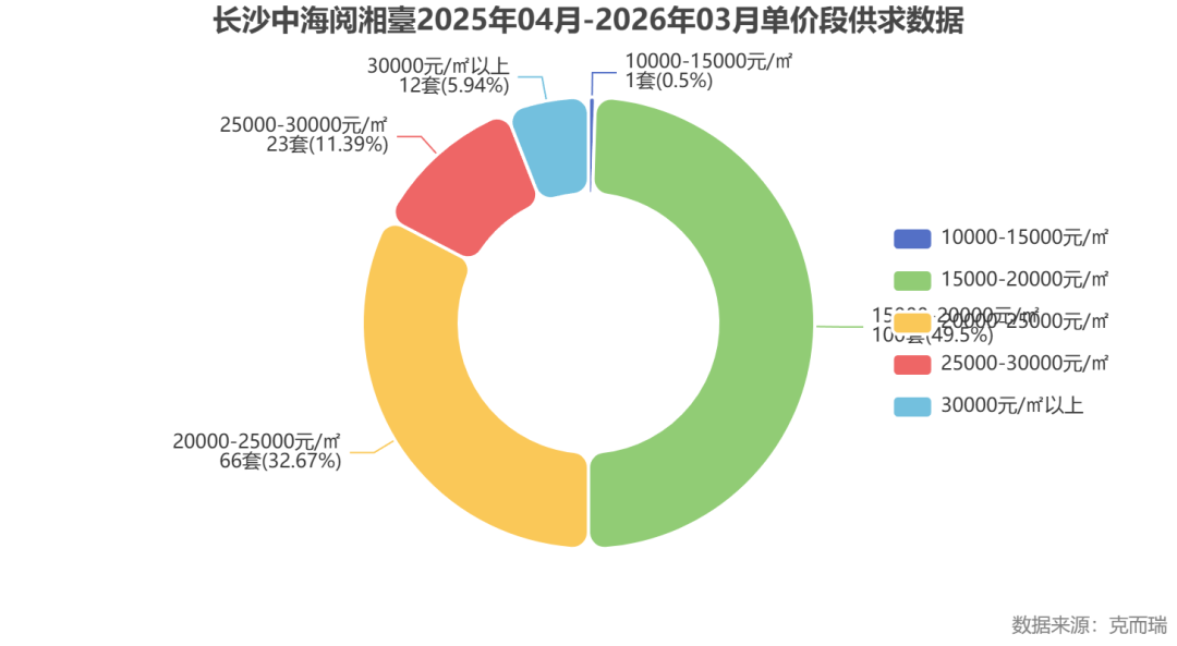 数据解读:克而瑞数据显示,中海阅湘臺的成交主力集中在1.5-2.5万/㎡的价格区间,与其25000-28000元/㎡的参考均价基本吻合,表明市场对其价值认可度较高,价格体系相对稳定。