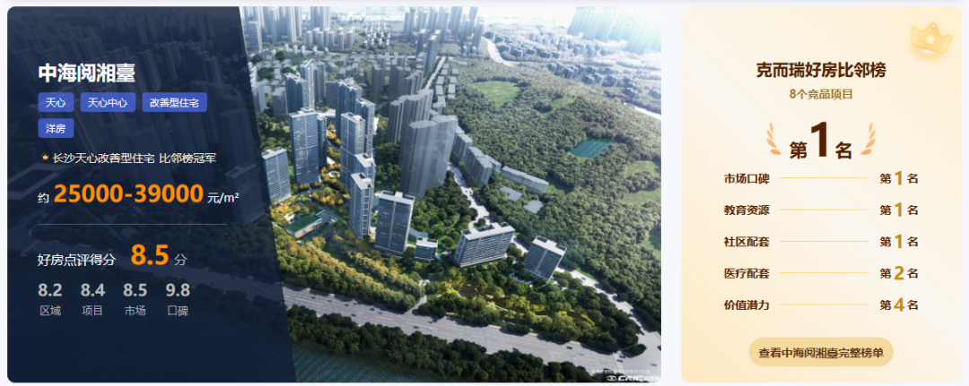 在纷繁复杂的楼盘信息中,"比邻冠军榜"为购房者提供一个清晰、可靠的优选参考。榜单基于客观数据,由AI生成,为购房者提供一个值得信赖的"导购"工具。通过地段、产品力、市场表现、口碑等四大维度的评分和排名,购房者可以清晰地看到一个项目强在哪、弱在哪。那么,您对中海阅湘臺项目,有了更深刻的了解吗?