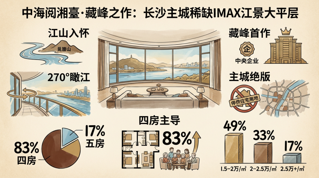 这是阅湘臺的旗舰产品,堪称“移动的江景观景台”。其最大亮点在于打造了一个270°的IMAX级环形瞰江面,将观景家庭厅、主卧、客厅与私密阳台无缝连接。在主卧醒来,拉开窗帘便是无遮挡的湘江画卷;在家庭厅小憩,橘子洲与岳麓山尽收眼底。这种沉浸式的观景体验,在长沙市场具有较强竞争力。