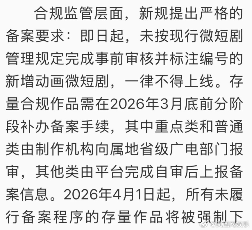 三、未备案漫剧4月1日起将强制下线3月14日消息,网传动画微短剧将从4月1日起执行备案制,未备案将被强制下线。早前发布的国家广电总局下发专项治理工作提示,从去年11月起到今年3月,会在全国范围内开展不良动画微短剧和动画短视频网络传播专项治理。其中,文章提及自2026年4月1日起,所有未履行备案程序的存量动画微短剧作品将强制下线。根据规定,各类动画微短剧将按重点、普通、其他三类实行分类分层审核,并全量纳入“白名单”制度,审核标准和把关尺度较以往更为严格。凤凰网娱乐直击短剧动态