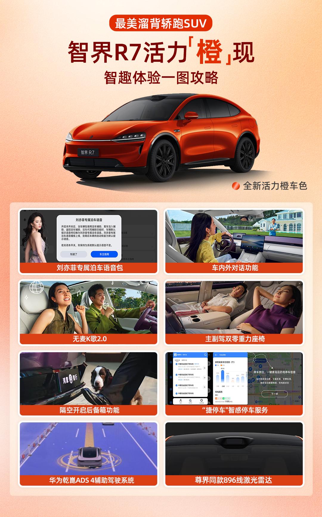 余承东亲自官宣新色,智界双7这套设计底子够硬 余承东首发智界汽车“活力橙”新色美图,能让他亲自站台的颜色,背后一定有说法。 先看智界R7的造型。轿跑SUV最难做的是比例,溜背收得太急显得局促,收得太缓又不够动感,R7的处理是让线条从B柱之后自然倾斜而下,配合侧面的流线型面,出来的效果是修长、低趴、有张力,都市年轻感一下就出来了。智界新S7走的是另一条路,肌肉线条做得饱满有力,姿态动感凌厉,像一头随时准备冲出去的猛兽。 这两套设计,本身就是冲着年轻人的审美去的。活力橙的到来,是把这种审美又往前推了一步。放在鸿蒙智行的体系里看,智界一直负责的就是造型上的先锋感,从极光绿到幻影紫,再到今天的活力橙,这条路线从来没变过。设计底子够硬,颜色才能站得住。