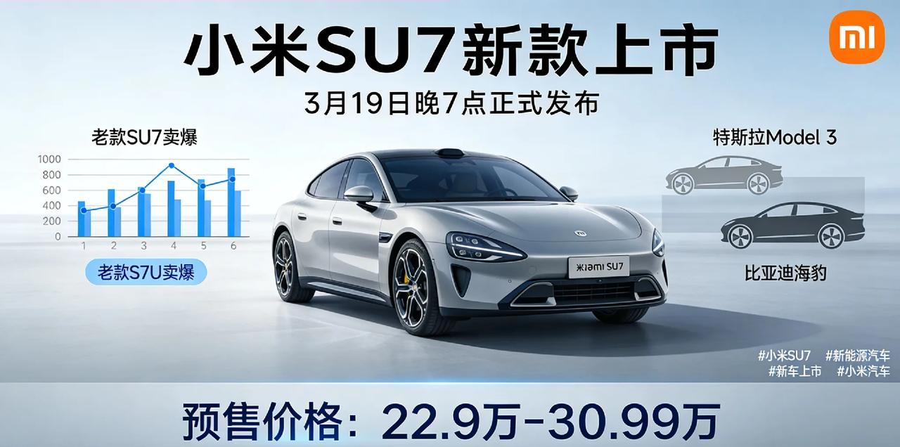 小米SU7新款要来了!22.99万起,这价格太香了 刚刷到消息,新一代小米SU7定档3月19日晚7点正式上市,预售价格直接给到22.99万-30.99万,比我预期还低! 作为小米首款纯电轿车,老款SU7本来就卖爆了,这次改款更是吊足了胃口。从曝光的信息来看,外观细节更运动,内饰和智驾系统估计也会升级,22.99万的起售价直接把中高端纯电轿车的门槛打下来了。 现在新能源市场卷得厉害,特斯拉Model 3、比亚迪海豹都在盯着这块蛋糕,小米这次直接用价格+配置组合拳,估计又要掀起一波订车潮。 坐等19号发布会,看看新款到底有多少惊喜,准备换车的朋友可以蹲一波了!