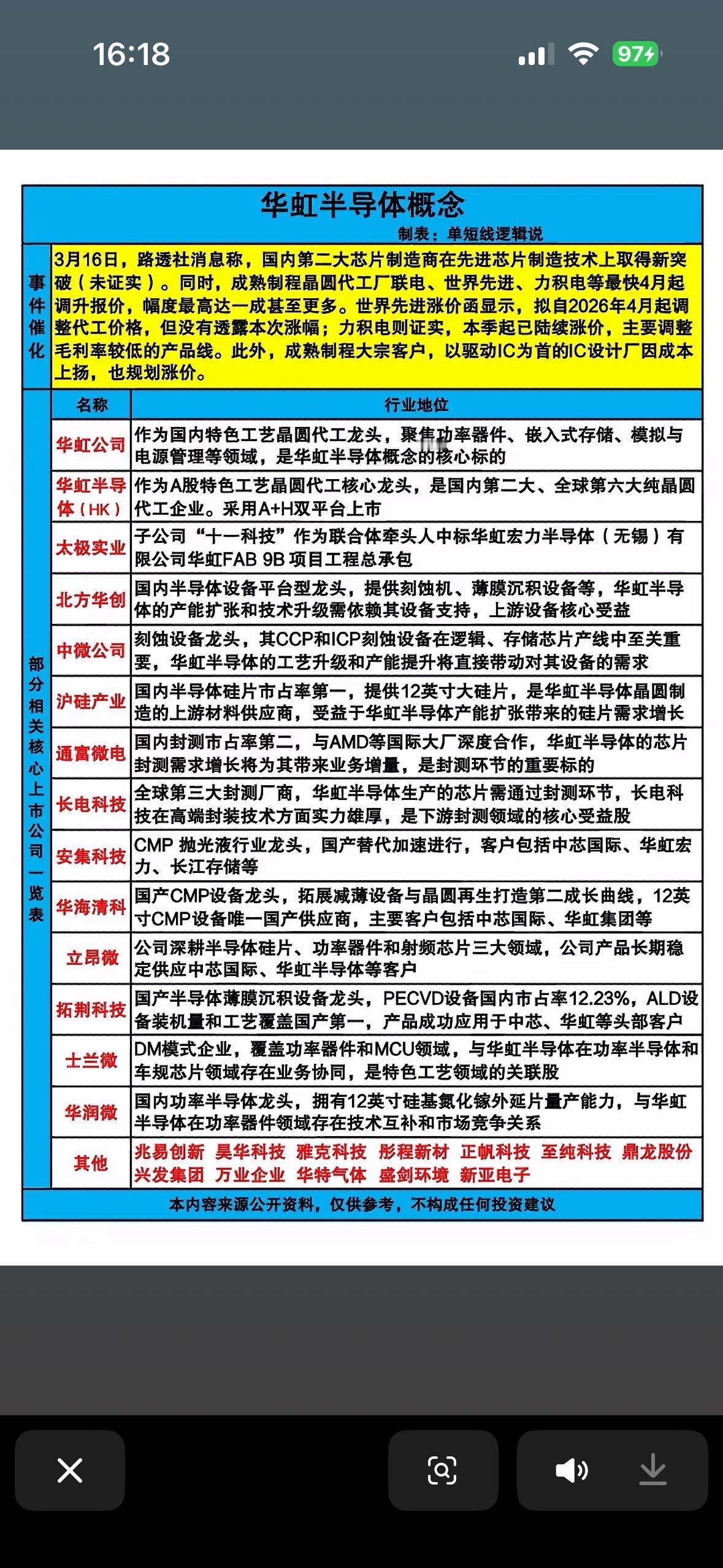"华虹半导体技术突破带动产业链涨价,国产芯片上下游协同发展,设备材料需求激增。" 华虹半导体技术突破这事儿可太牛了,直接带动产业链涨价,让国产芯片上下游开启协同发展模式。这一突破促使设备材料需求激增,就像给国产芯片产业打了一针强心剂。 以前咱在芯片领域常被卡脖子,现在华虹半导体搞出技术突破,上下游企业也跟着受益。比如设备制造商订单量大幅增加,材料供应商的产品也供不应求。这不仅能提升国产芯片的自给率,还能推动整个产业升级。相信在华虹半导体的带动下,国产芯片未来会有更亮眼的表现,在国际市场上也能占据一席之地。