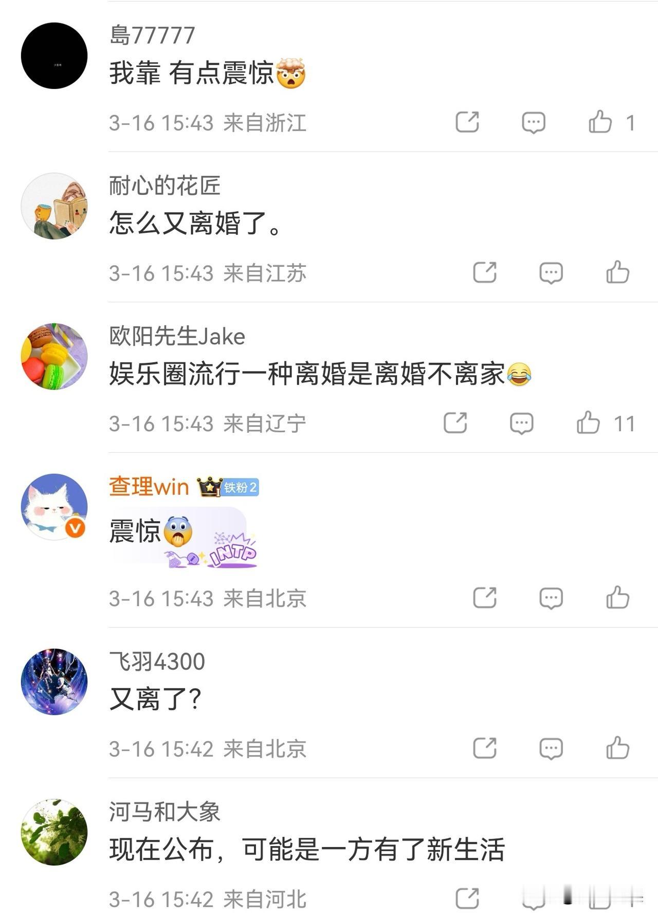 姚晨曹郁,太让人意外了! 3月16日,姚晨和曹郁突然发联合声明官宣离婚,直接把网友都整懵了。 原来俩人早就结束婚姻了,当年因为孩子还小,一直没对外说。 如今发声明也说得特别平和:一起养了一儿一女,还合伙开了艺术电影公司,从朋友变家人,以后也做家人一样的朋友,继续一起守孩子、搞事业。 回顾两人的感情,2011年恋情曝光,2012年在新西兰举行婚礼,婚后育有一儿一女,携手走过十余年时光,还一起创办了影视公司,本是众人眼中的神仙夫妻,如今却以这样的方式画上句号,难免让人意外。 姚晨曹郁官宣离婚的消息一出,评论区全是网友的震惊声“怎么又离婚了?”,还有人总结娱乐圈的现状,打趣说“娱乐圈流行一种离婚不离家”,甚至有人猜现在公布,是不是一方有了新生活。 虽然大家满是意外,但不得不说,姚晨曹郁俩人处理得还挺体面的。 没有互撕,没有狗血,就以朋友的身份结束婚姻,还约定继续一起陪伴孩子、合作工作。 只是十几年的感情走到这一步,还是让不少网友觉得可惜,也让人感叹娱乐圈的感情变化真的太快了。