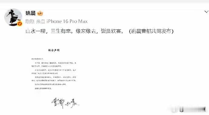 姚晨曹郁官宣离婚,2026年3月16日,演员姚晨与摄影师曹郁通过微博同步发布联合声明,平静宣布二人已于多年前结束婚姻关系,因当时子女年幼,选择暂不公开这一事实,直至今日才坦然告知公众。这则没有撕扯、没有争议的官宣,瞬间刷屏全网,让无数人在感慨中读懂了父母对孩子最深沉的守护。 声明以温润的文字开篇:“山水一程,三生有幸。缘来缘去,皆是欢喜。”短短一句话,道尽了这段十三年相伴时光的释然与感恩。更让人动容的是,两人明确表示:“曾经我们是珍贵的朋友,后来是家人,以后是家人一样的朋友。”未来,他们将继续以共同守护者的身份,陪伴儿子“小土豆”、女儿“小茉莉”成长。 值得一提的是,两人在事业上始终保持着良好的协作关系。曹郁作为国内顶级摄影师,曾为《摆渡人》《妖猫传》等经典影片掌镜,与姚晨多次合作;姚晨凭借《武林外传》《潜伏》等作品成为国民度极高的演员,两人还共同参与了影视公司的运营。即便婚姻关系结束,他们也没有割裂事业联结,而是继续在专业领域携手,这份“公私分明”的清醒,让这段关系的收尾更加体面。 从2012年结婚到如今官宣离婚,十三年的时光里,他们经历了热恋、相守,也经历了磨合、分离。最终选择以“家人一样的朋友”身份相处,既是对过往感情的尊重,也是对未来的从容规划。对于姚晨而言,这是她经历的第二段婚姻,从早年的舆论风波到如今的坦然释怀,她在婚姻中不断成长,学会了以更成熟的姿态面对情感与责任;对于曹郁而言,这段经历让他懂得了珍惜与放手,在事业与生活中保持着温和的底色。 网友们在得知消息后,纷纷表达理解与祝福:“最体面的离婚,是不伤害孩子,不诋毁彼此”“把孩子放在第一位,这就是父母最好的样子”“爱过不后悔,分开不纠缠,成年人的榜样”。这份祝福的背后,是人们对健康亲密关系的向往——婚姻的意义不在于永远绑定,而在于彼此成就、温柔相伴,即便走到终点,也能留下善意与温暖。 了新的人生阶段,姚晨继续深耕演艺事业,同时专注于公益与家庭;曹郁依然活跃在摄影领域,用镜头记录美好。他们的选择证明,婚姻的结束不代表情感的终结,分离也不意味着失去温情。