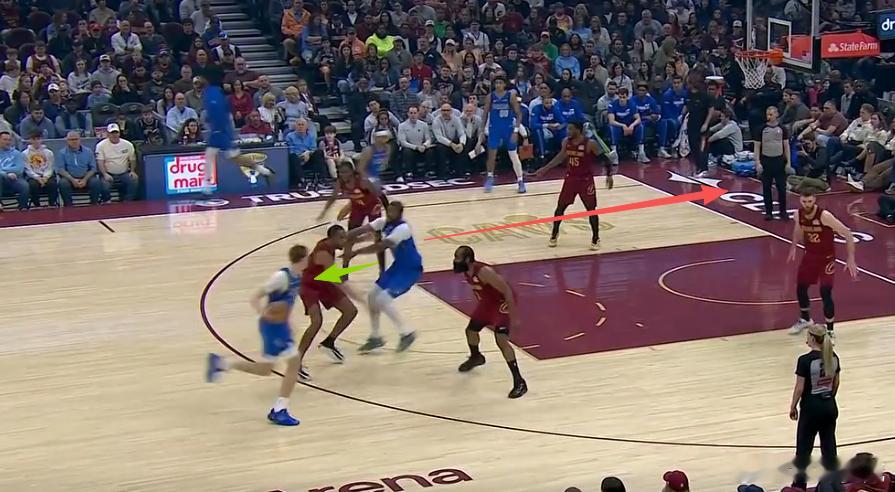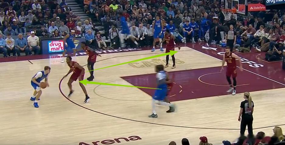 下面就跟随镜头,来逐帧拆解弗拉格在本赛季那些精彩的阅读防守&通过传球打穿防线的回合。1234弗拉格弧顶持球与无球上提的马绍尔发动“Touch Screen”配合,见马绍尔通过“Touch Screen”快速拆走、抓骑士换防的时间差获得顺下身位优势后,立即在挡拆行进间球领人传球找到,助马绍尔上篮得手。