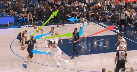12 13 14弗拉格上线持球与加福德发动挡拆,挡拆行进间吸引到双人夹击的瞬间、赶在乔治换防到顺下加福德前,立即跳传找到顺下的加福德。