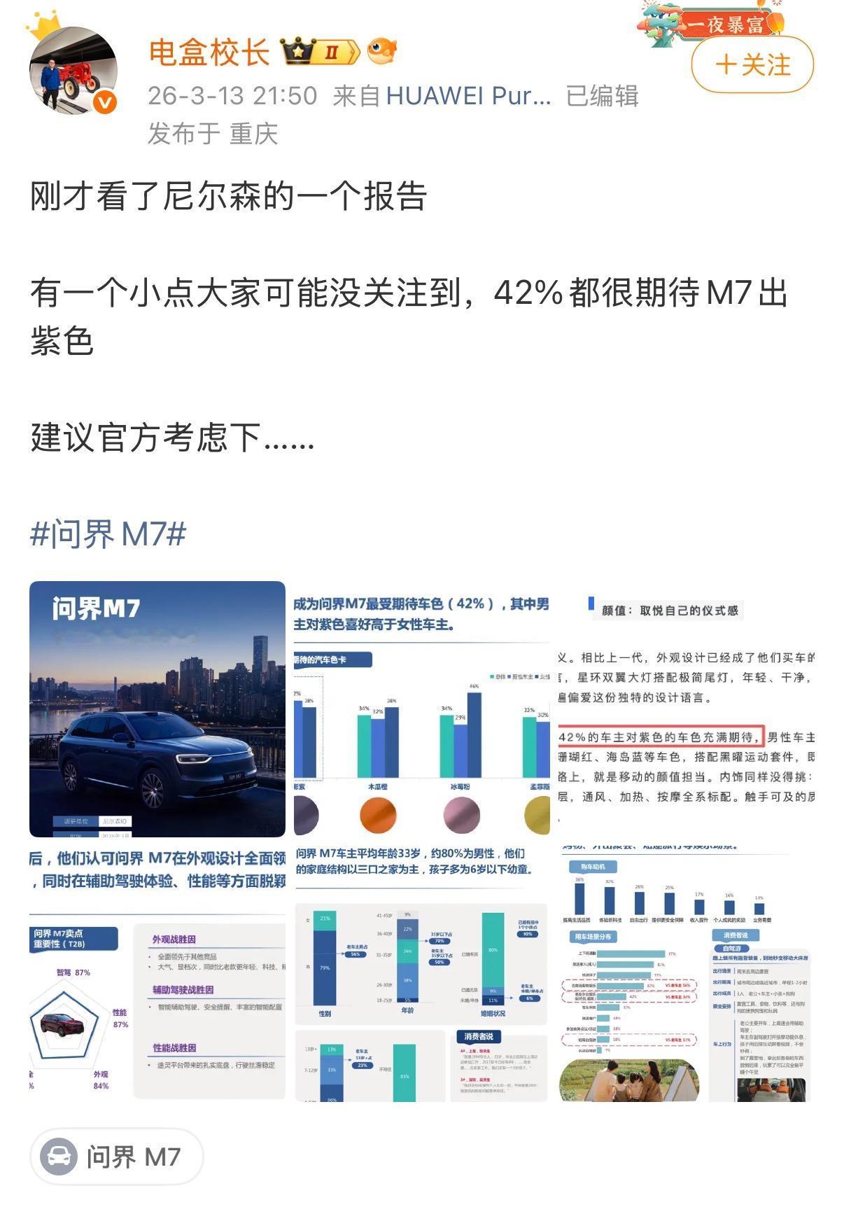 3月16日,鸿蒙智行正式宣布旗下热门车型问界M7即将推出全新夜紫车色,新车色尚未实车亮相但已经值得期待。 当前国内汽车市场依旧以黑白灰等传统色调为主流,不少消费者对单一配色产生审美疲劳。问界M7此次推出的夜紫车色,以低调高雅的质感打破传统格局,既不张扬浮夸,又拥有极强的辨识度,能够在车流中轻松脱颖而出,为追求独特品味的用户提供了全新选择。 夜紫车色不仅是外观上的创新,更代表着独立、不盲从的生活态度,精准契合当下消费者个性化、多元化的用车需求。凭借高级的色彩质感与时尚设计,问界M7夜紫版迅速成为话题焦点,进一步提升了车型热度与市场期待值。 作为鸿蒙智行旗下实力车型,问界M7一直以产品力与用户口碑备受青睐,此次新增夜紫配色,进一步丰富了车型选择。据官方消息,3月23日发布会将公布夜紫版更多细节信息,这款高颜值新车色,有望成为2026年车市个性化潮流的新选择。 问界M7官宣夜紫新色 问界M7新车色亮相