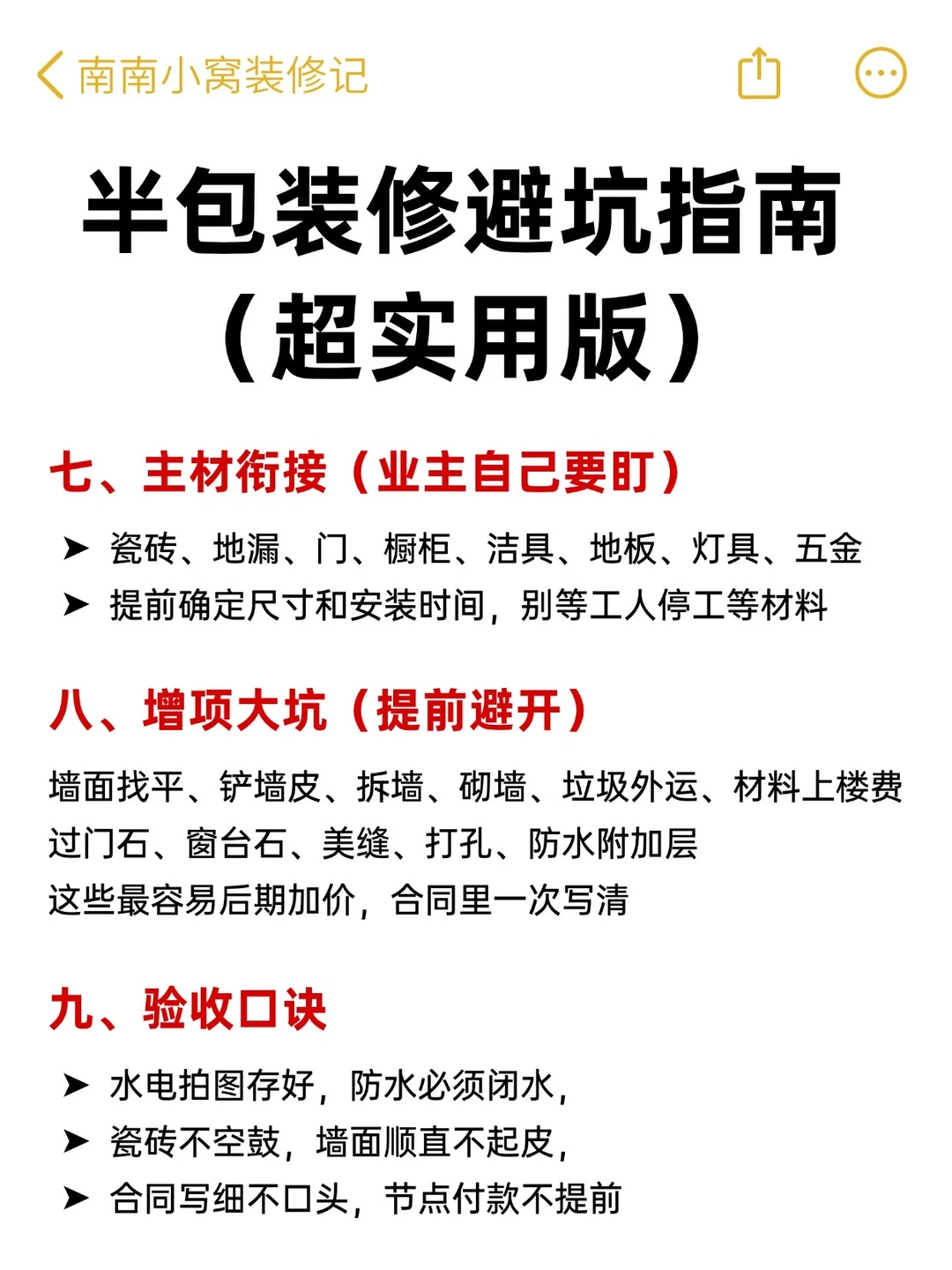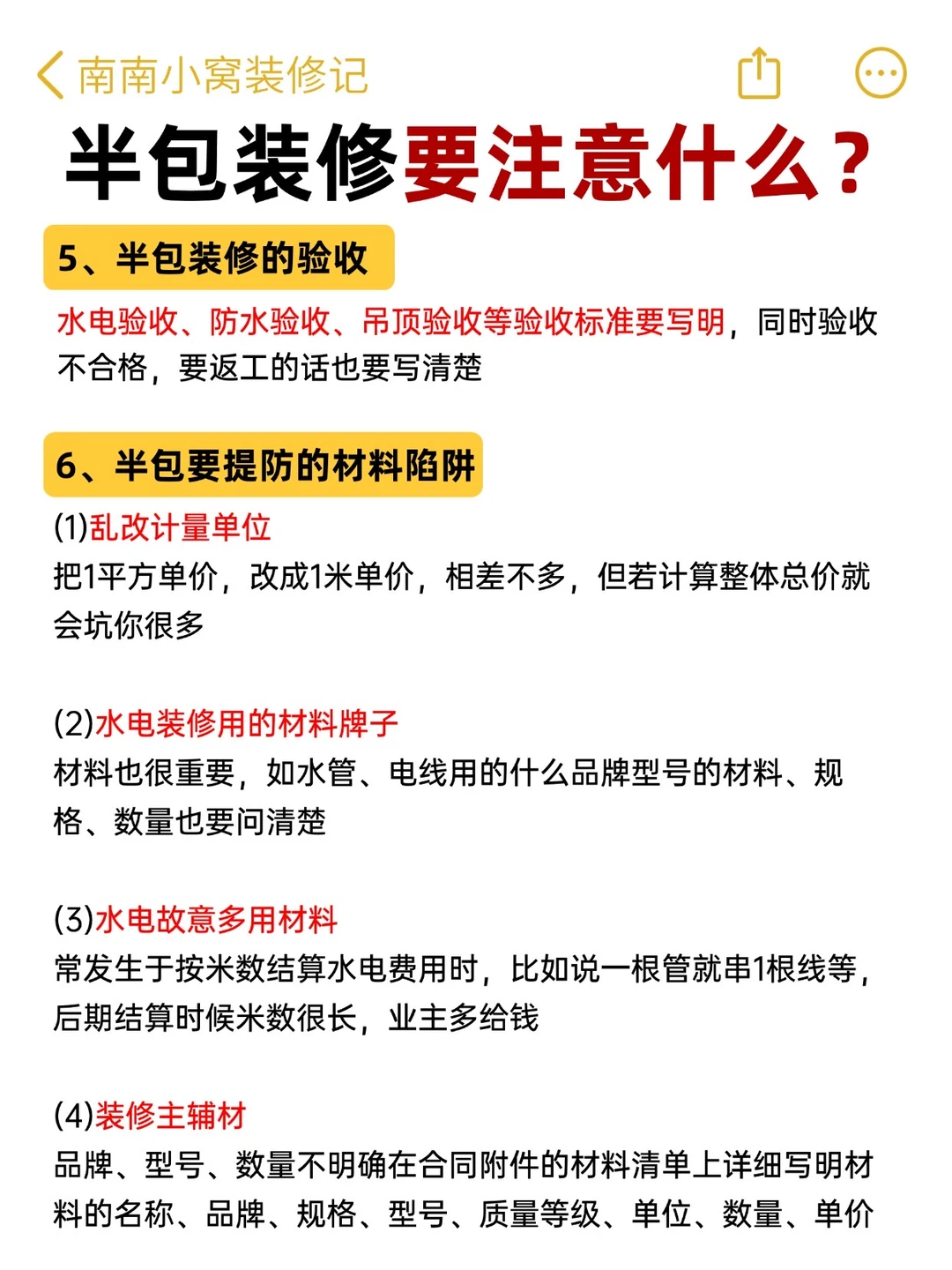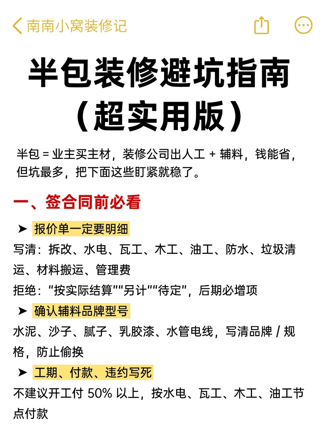 半包装修,别看它省心💰!!其实坑可多了!尤其第一次装修的朋友根本不知道怎么办,今天南南就把全流程和注意事项⚠️整理出来了 - ✅希望大家每个施工环节心里有数: 👉🏻该配合师傅做点啥? 👉🏻哪些材料得自己买?啥时候进场? 👉🏻哪些地方容易踩坑? 祝大家都能顺利装修不踩坑