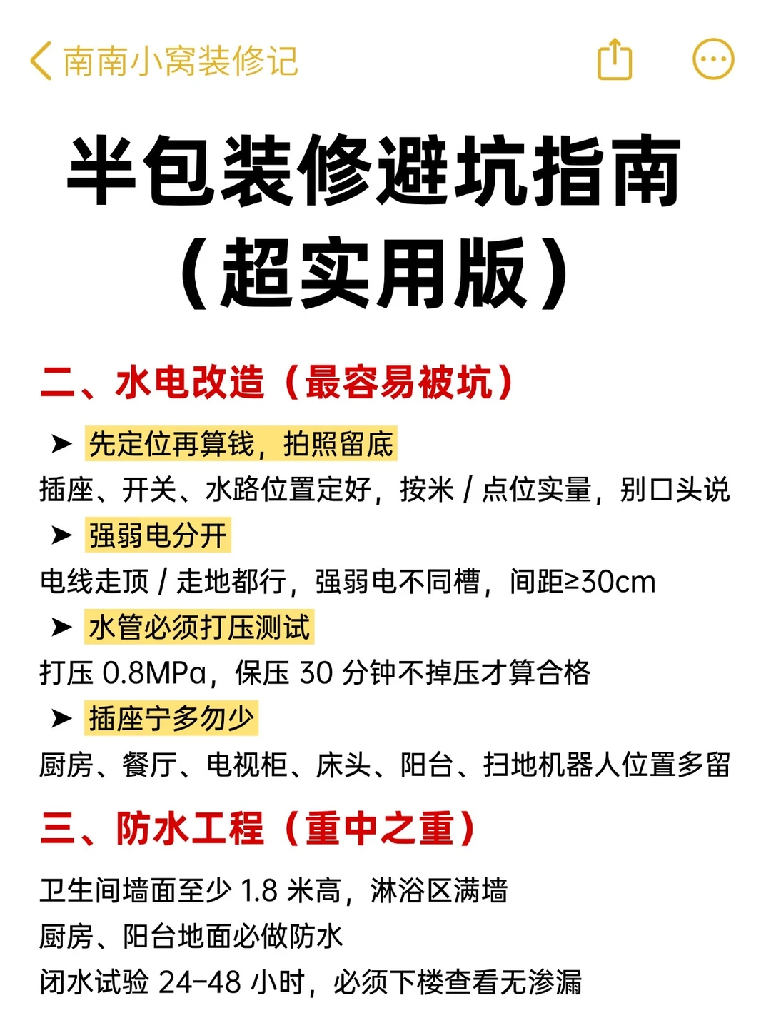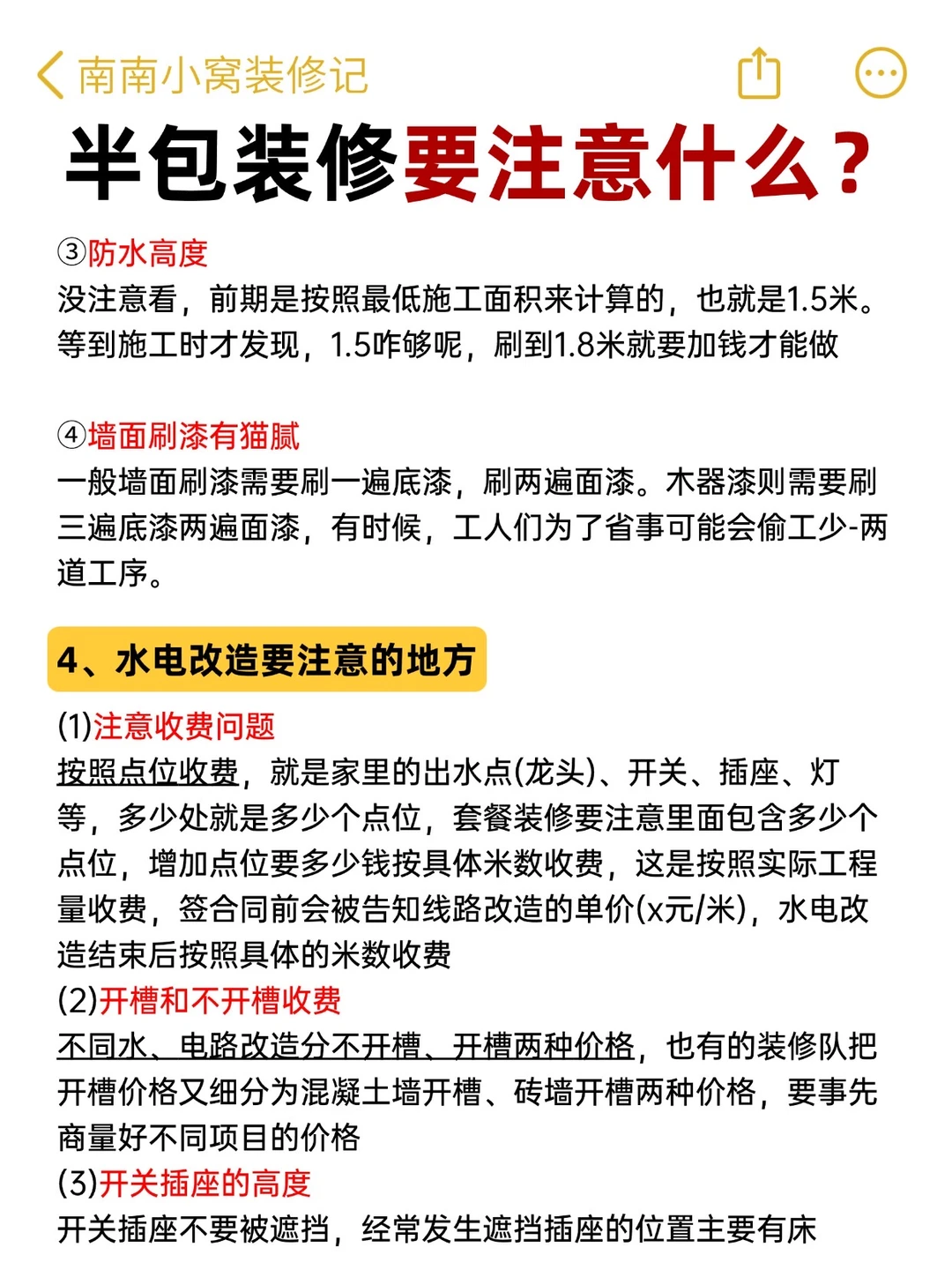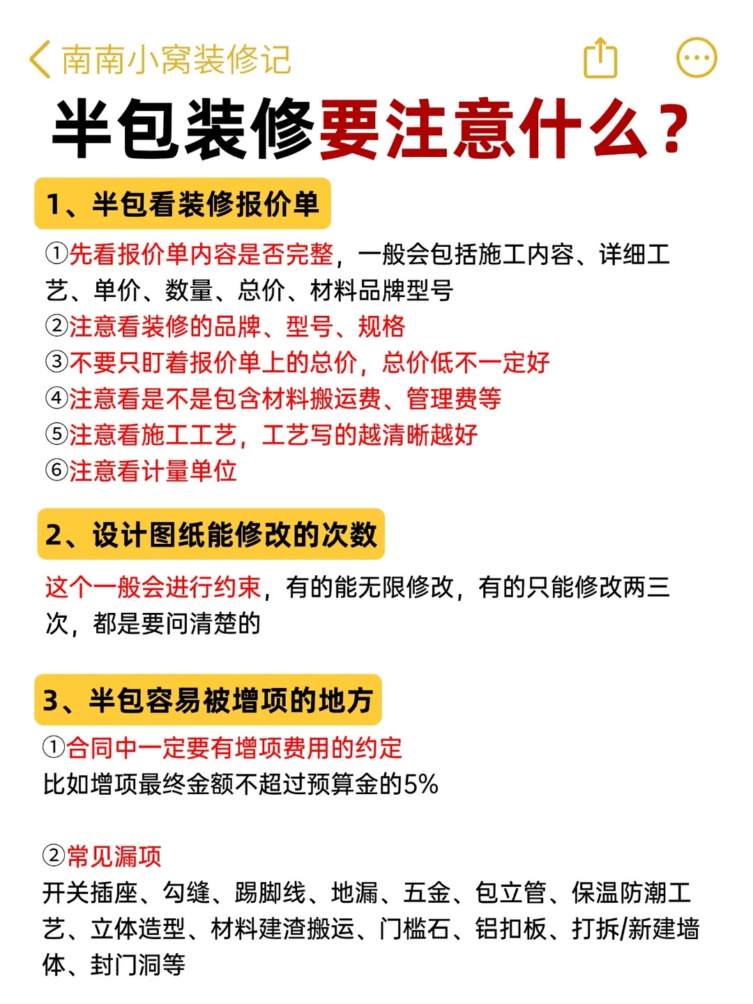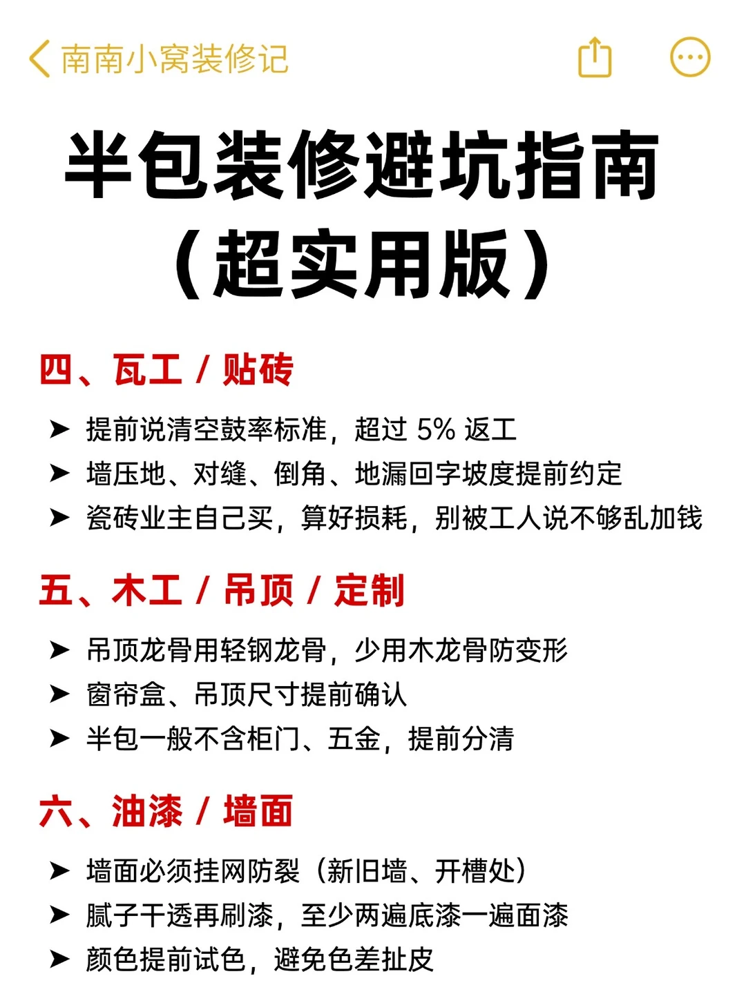 半包装修,别看它省心💰!!其实坑可多了!尤其第一次装修的朋友根本不知道怎么办,今天南南就把全流程和注意事项⚠️整理出来了 - ✅希望大家每个施工环节心里有数: 👉🏻该配合师傅做点啥? 👉🏻哪些材料得自己买?啥时候进场? 👉🏻哪些地方容易踩坑? 祝大家都能顺利装修不踩坑