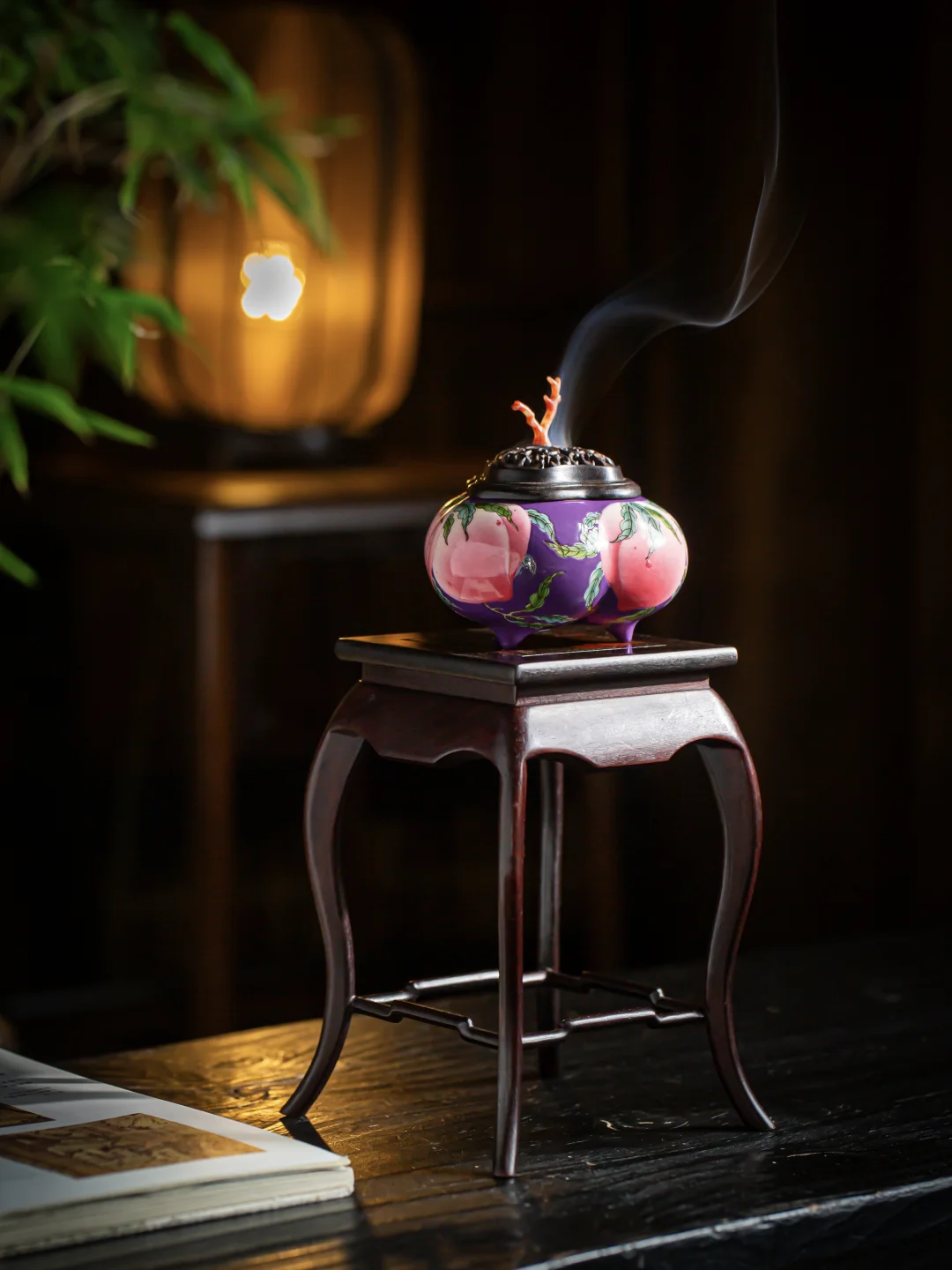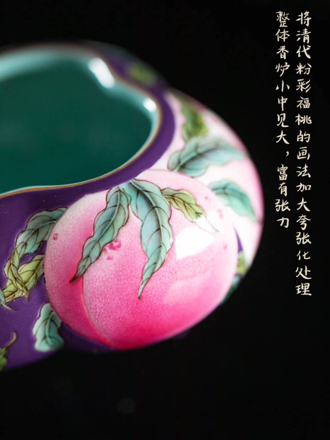夸张的福桃画法配上底色晕染的紫,饱满得几乎要撑破炉身。小中见大,说的就是它——明明不大,却有一种扑面而来的张力。摆在案头,像一句不用说的吉祥话。