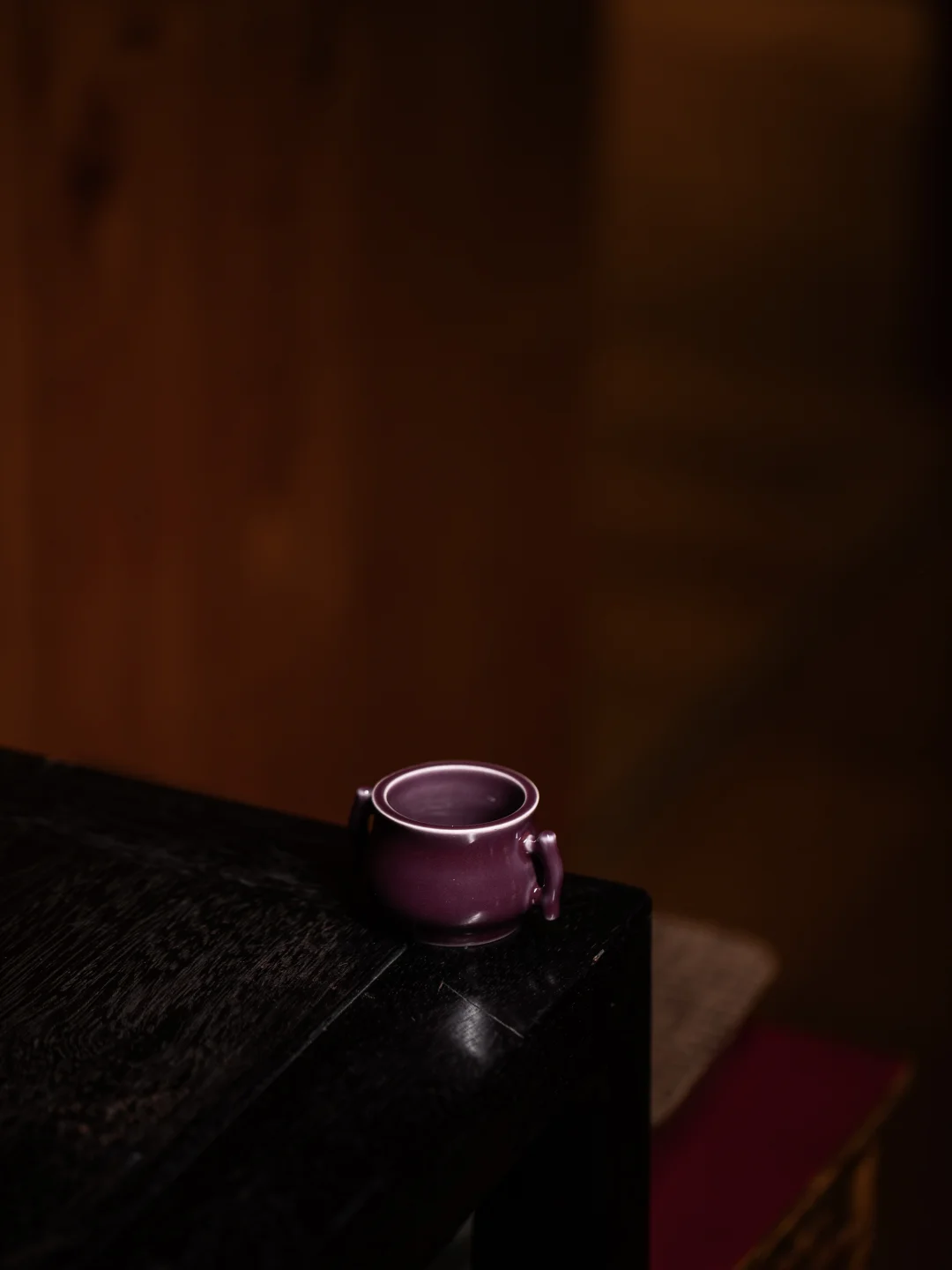 茄皮紫釉,弱还原烧出来的颜色,深沉里有光。它小巧,可以放在书桌一角,也可以随身带走。鱼耳的造型,添一点灵动的意思。紫气不必铺天盖地,这一小点就够了。
