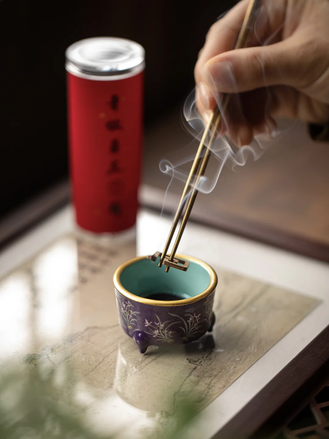 紫釉为底,兰花取自明代刺绣的画片。粉彩的工艺,把那种细腻的、层层叠叠的美留在了炉身上。放在茶席边,泡茶时抬眼看见,会觉得这杯茶都比平时香了几分。