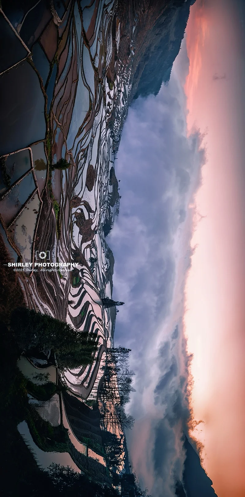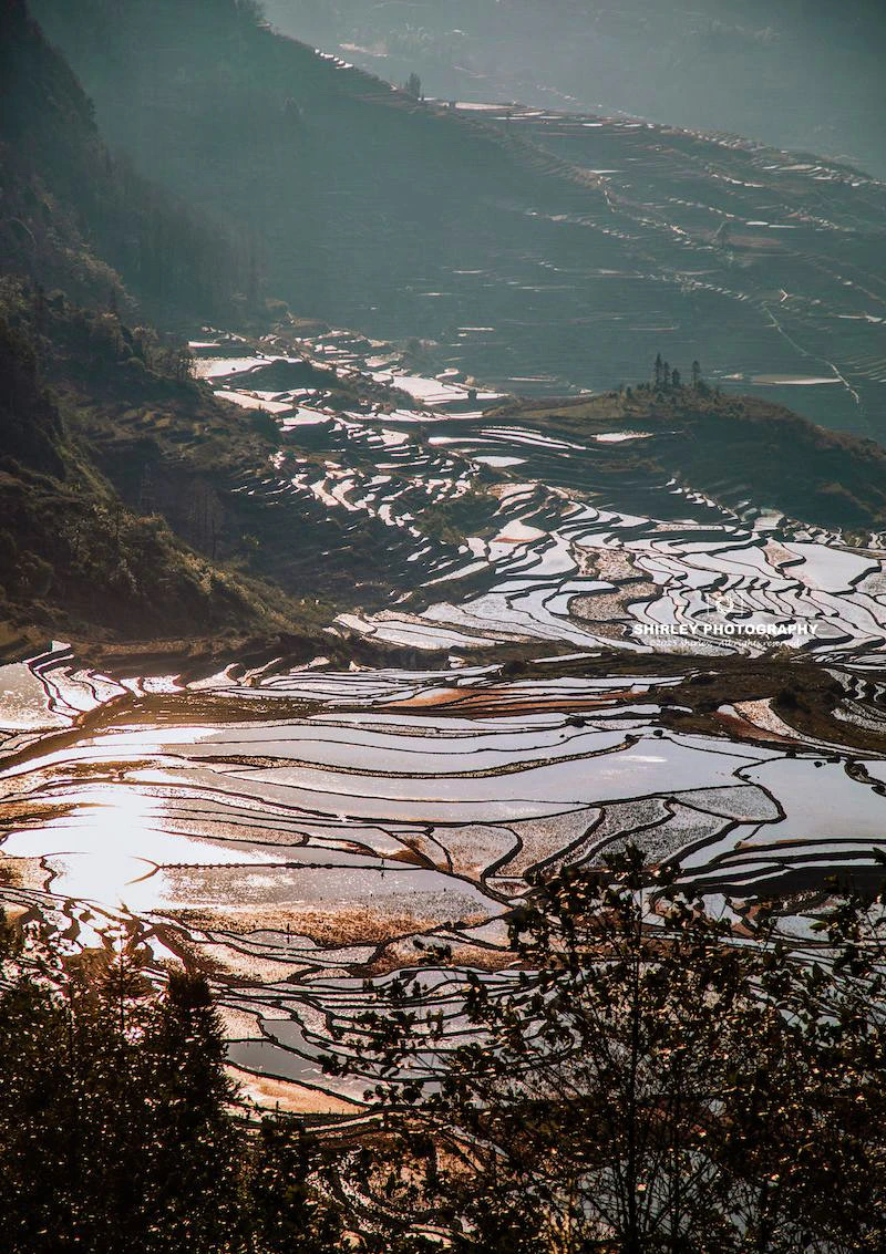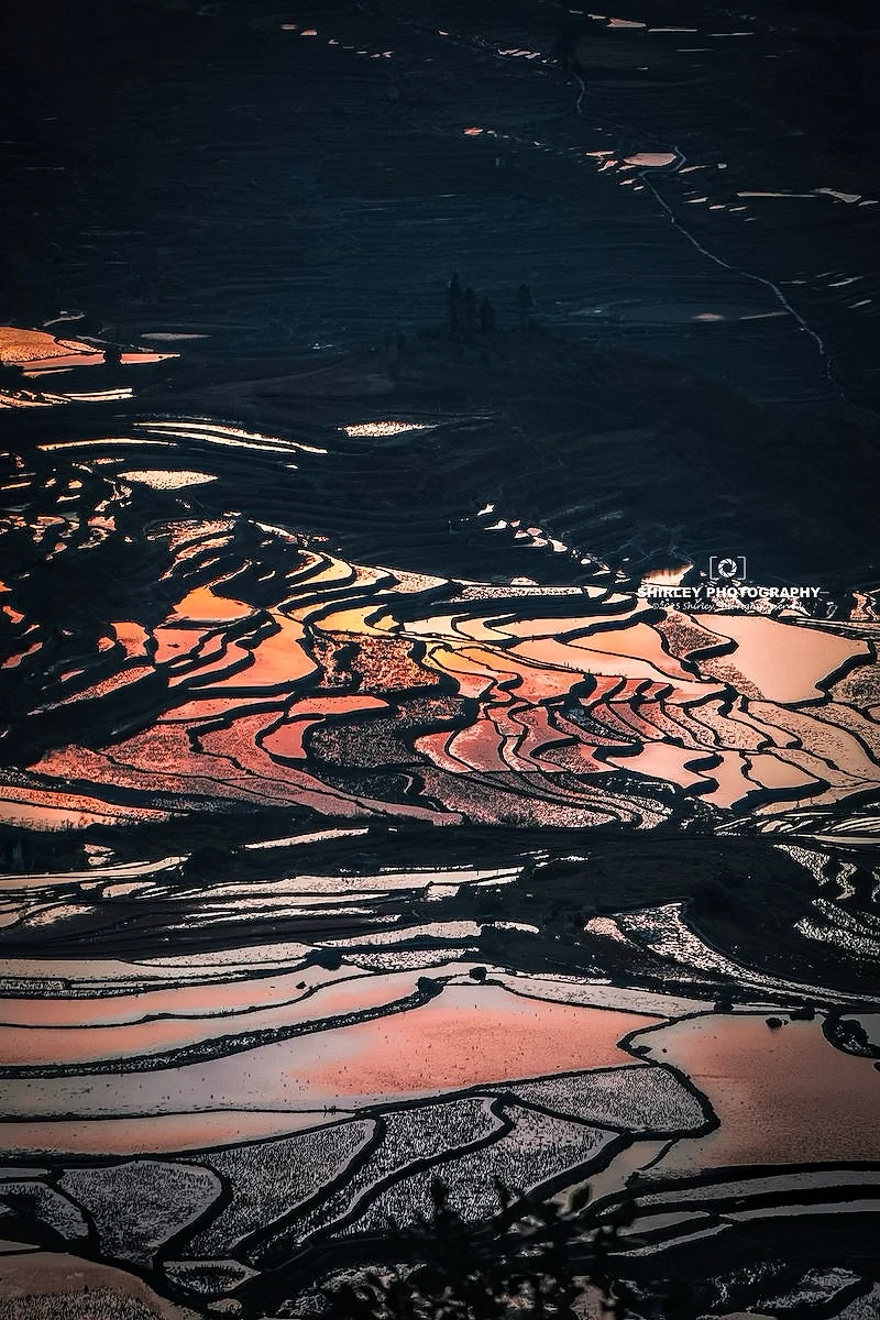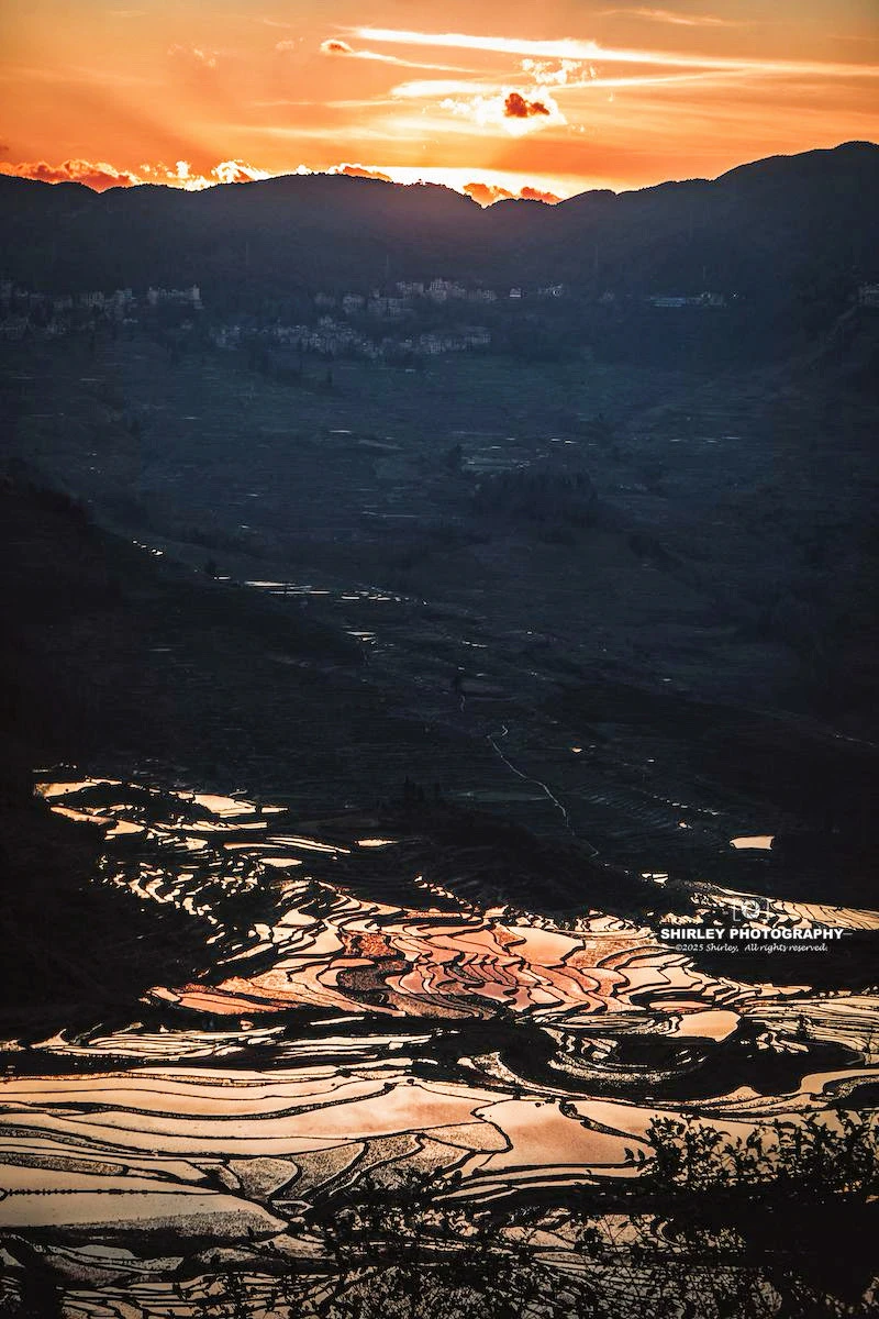 👍🏻优点:正对日落方向,梯田虽不大但侧面展示角度比坝达更好。有树枝遮挡但影响不大,需要长焦,有三脚架最好。夕阳西下时梯田呈金红色镜面,有晚霞更加分。