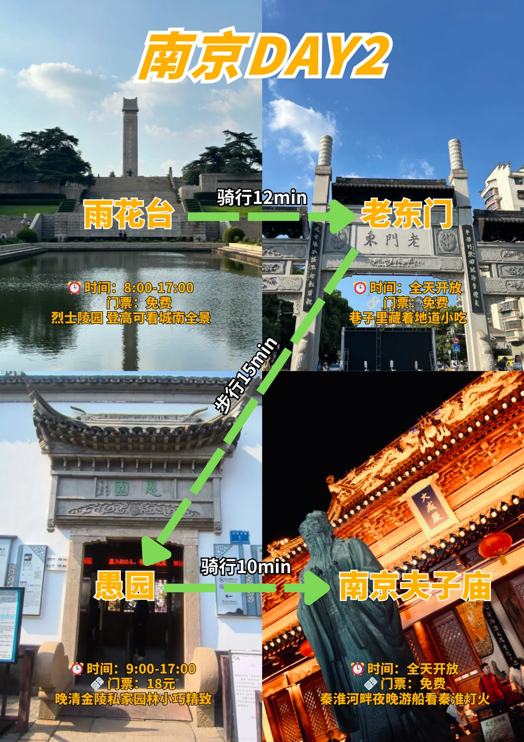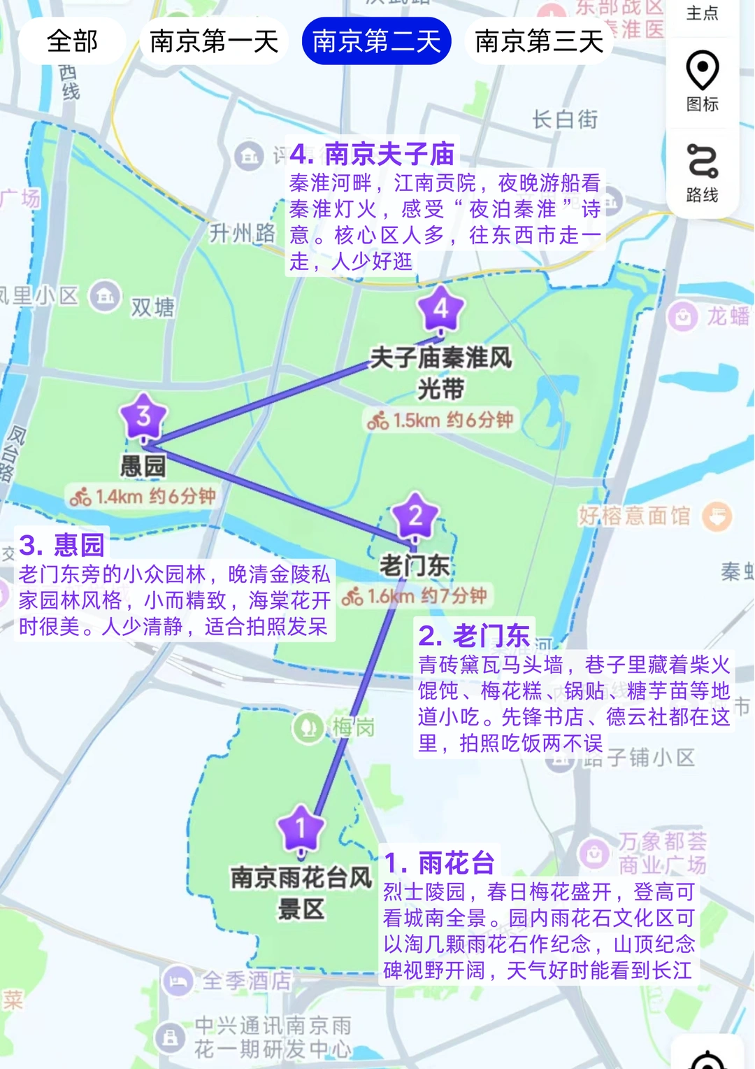 雨花台(春日梅花盛开)→ 骑行12分钟 → ”老门东(青砖黛瓦,巷子藏小吃)→ 步行15分钟 → 南京夫子庙(夜游秦淮看灯火)→ 骑行10分钟 → 愚园(晚清私家园林)