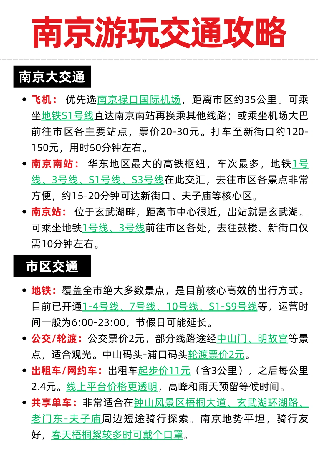 • 高铁:南京南站(车次最多)、南京站(紧邻玄武湖)