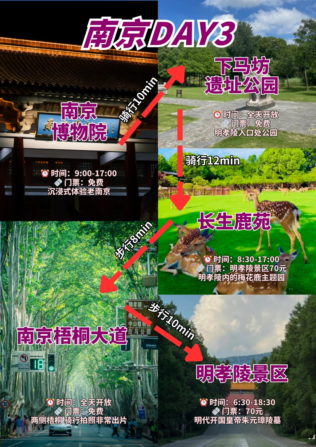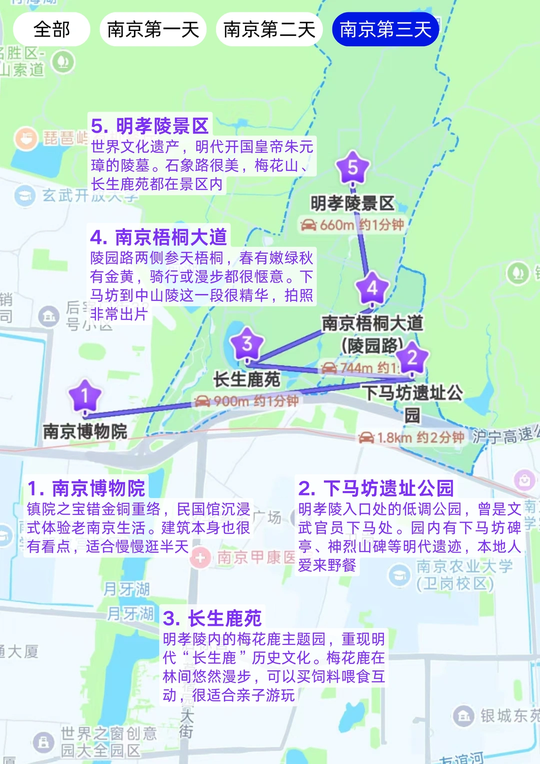 明孝陵景区(石象路绝美)→ 步行10分钟 → 南京梧桐大道(陵园路骑行拍照)→ 步行8分钟 → 长生鹿苑(喂小鹿互动)→ 骑行12分钟 → 下马坊遗址公园(明代遗迹)→ 骑行10分钟 → 南京博物院(镇院之宝错金铜重络)