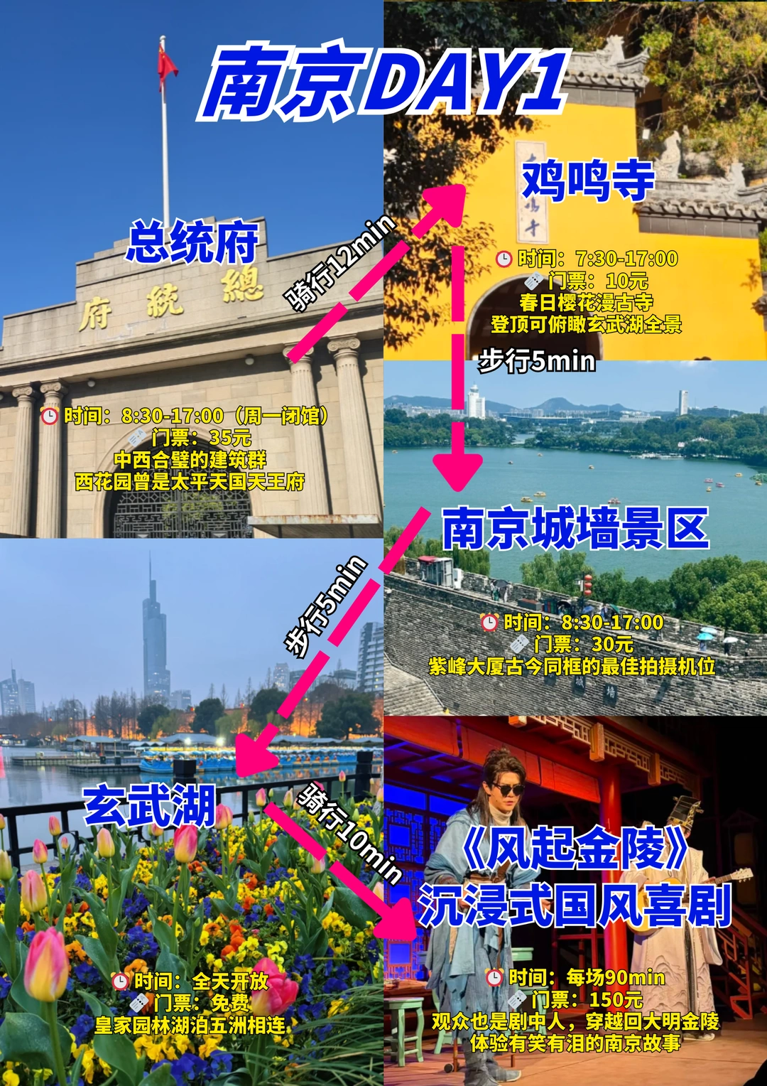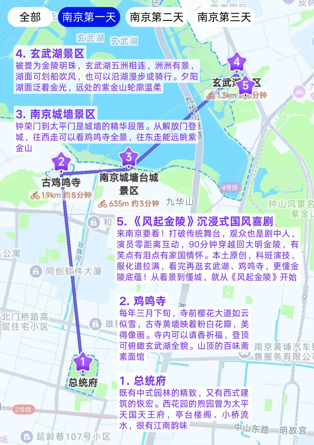 玄武湖景区(金陵明珠)→ 步行5分钟 → 南京城墙景区(登城墙看鸡鸣寺全景)→ 步行5分钟 → 鸡鸣寺(樱花季美成画)→ 步行10分钟 → 《风起金陵》沉浸式国风喜剧(观众也是剧中人)