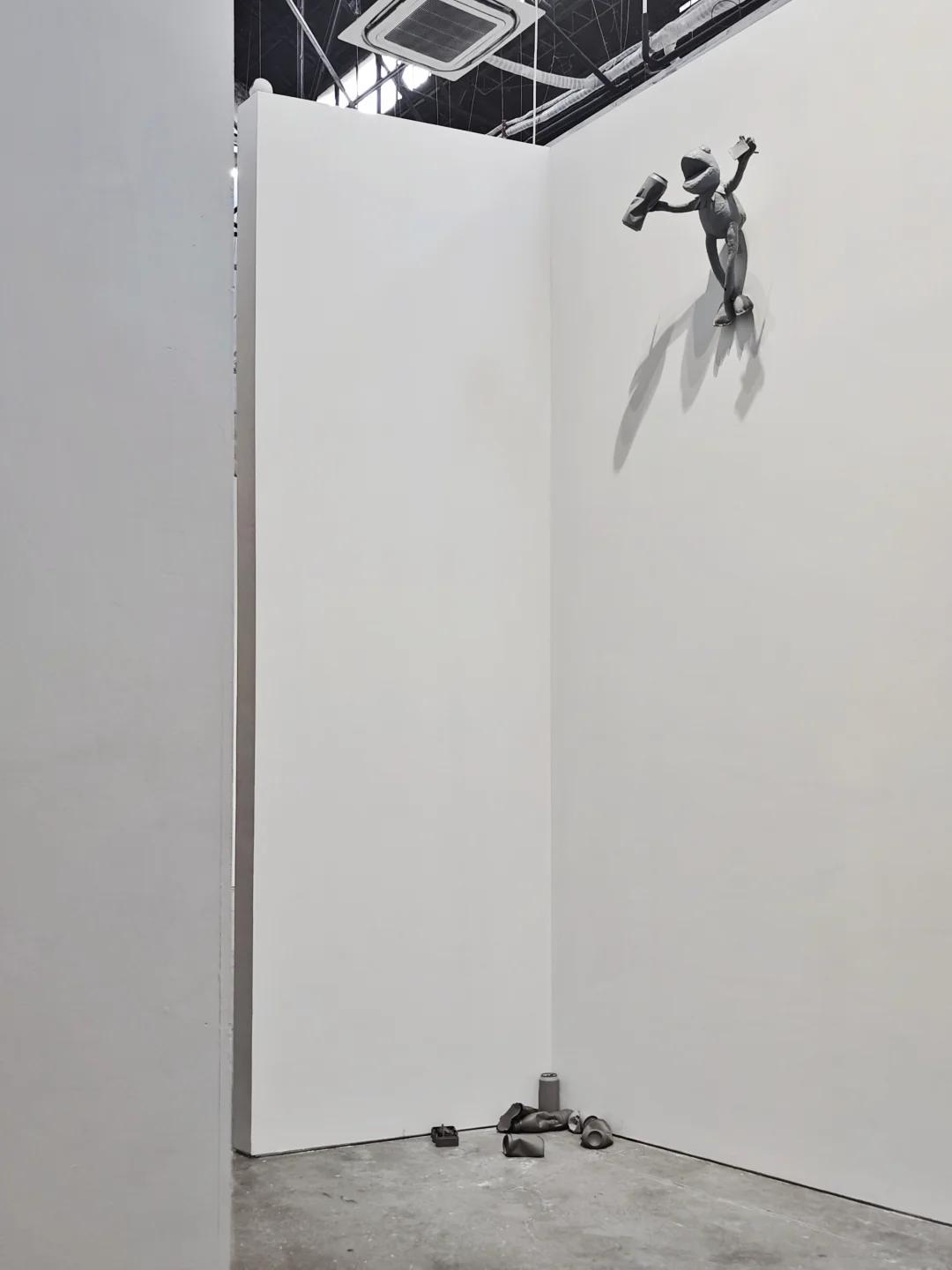 戏仿艺术史形象(Kippenberger的《被钉子十字架上的青蛙》一手啤酒,一手鸡蛋)、青蛙的形象被替换成流行文化符号(《芝麻街》中的角色)和消费剩余物(饮料食物空罐)并置,用单一的灰色消解全球化商品逻辑背后的文化属性