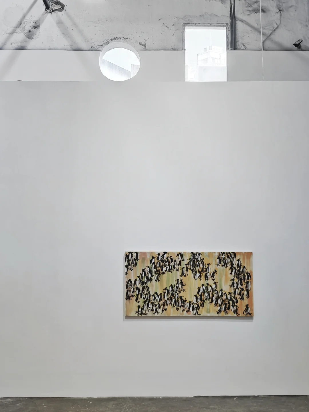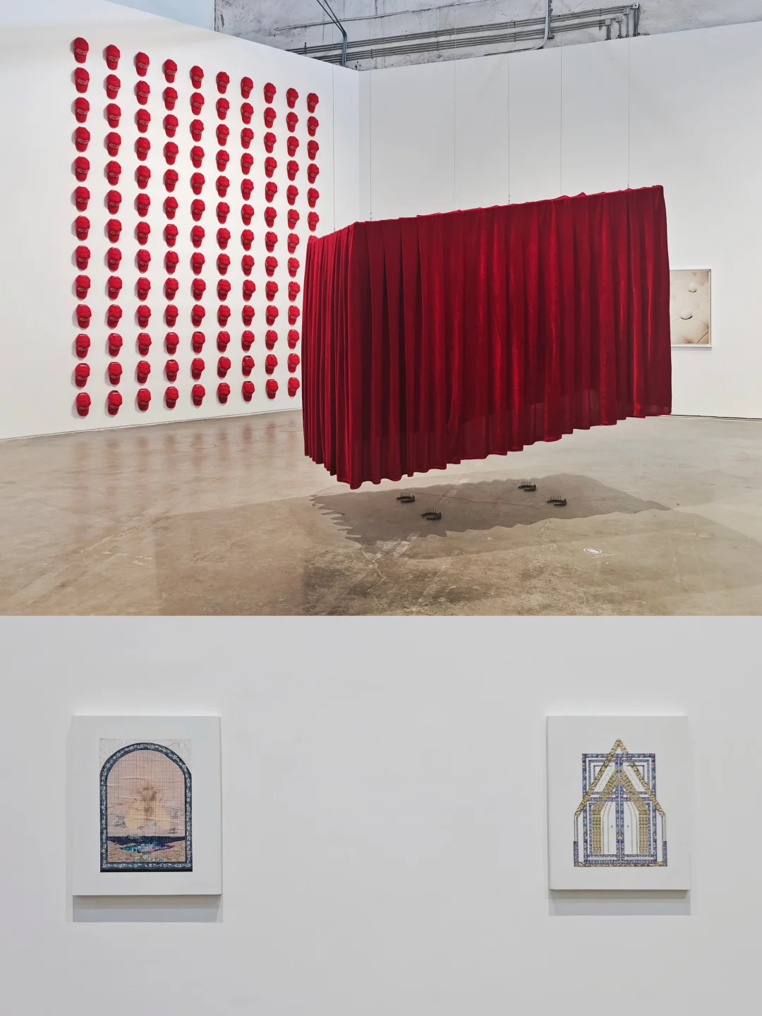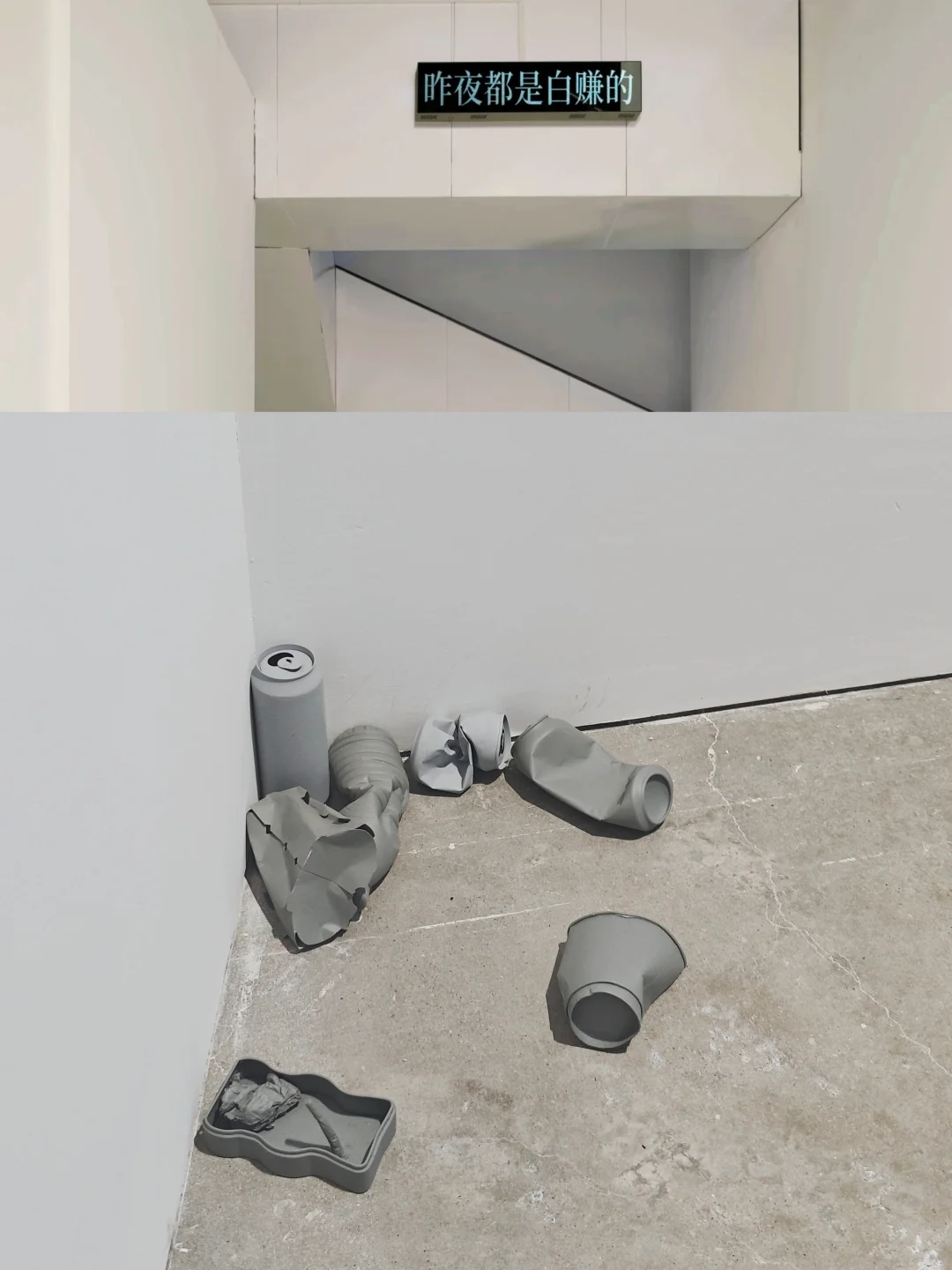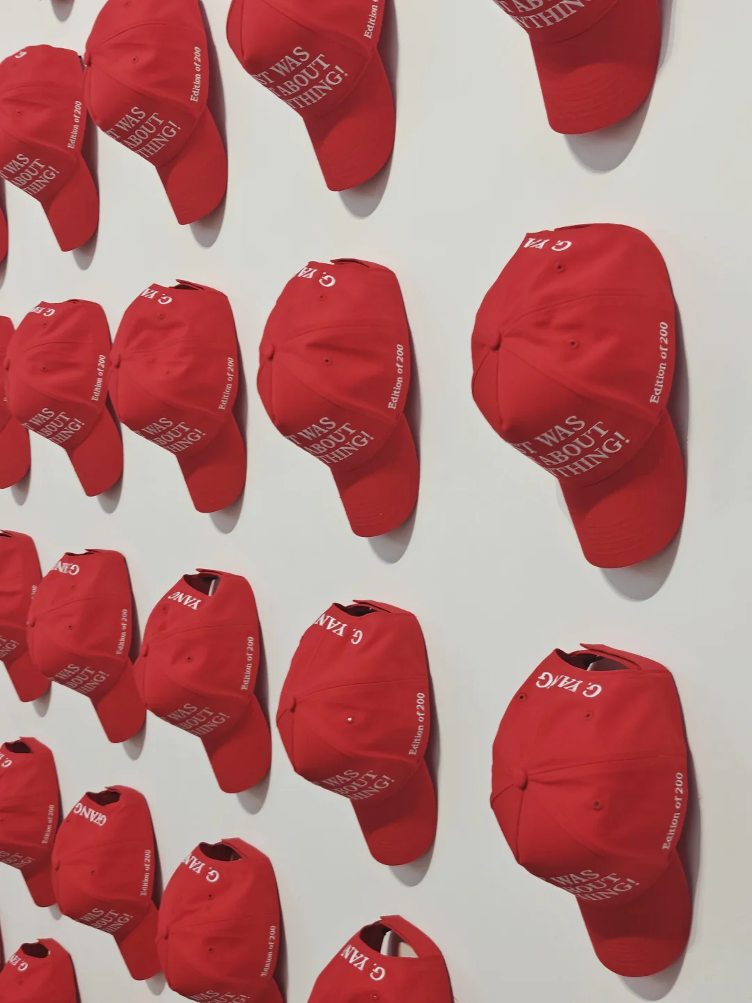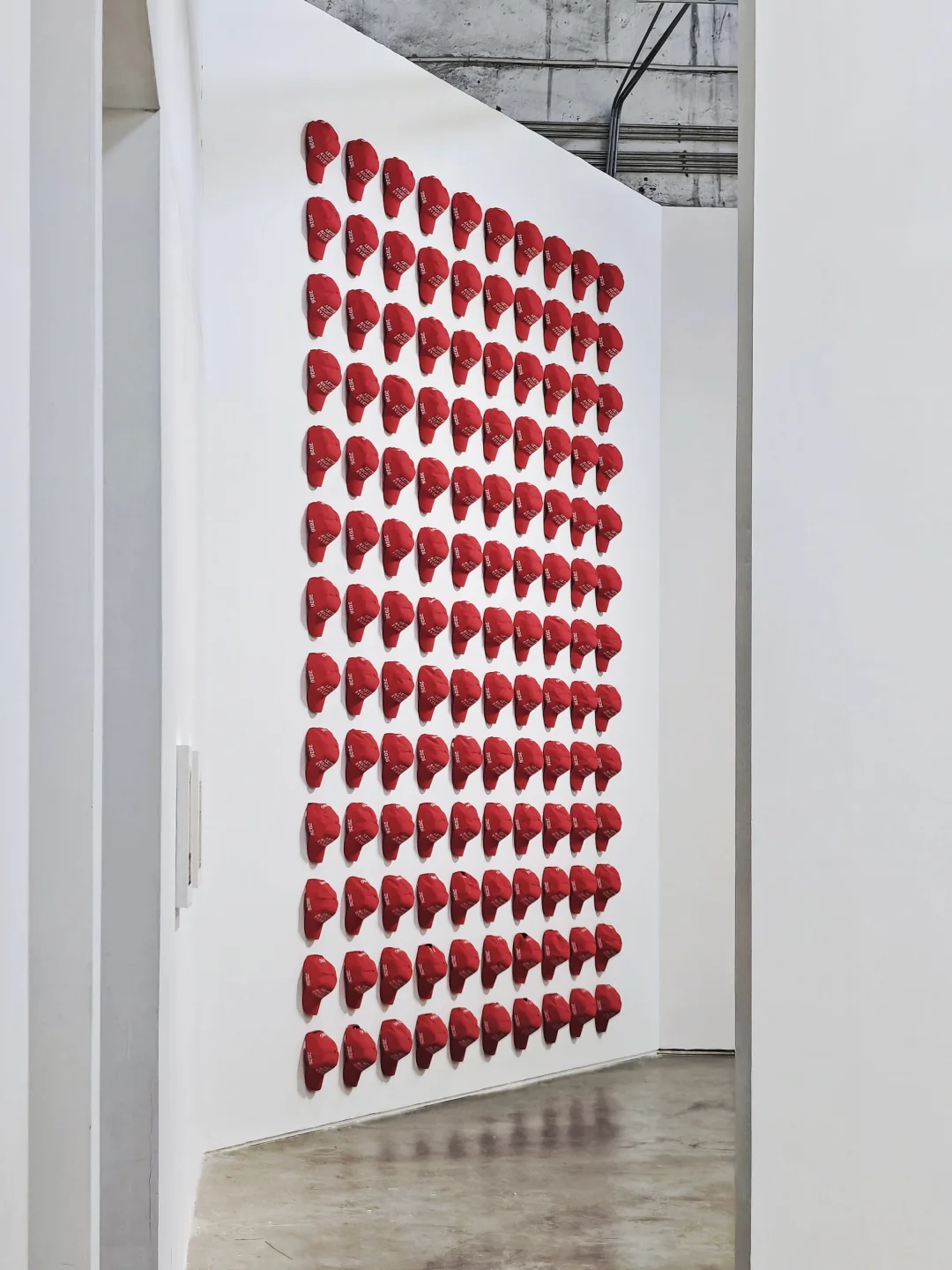 一整面墙写着白色标语的红色鸭舌帽视觉攻击性强烈,艺术家联系到承接国外政治应援品(这不用说也知道是谁的)的中国代工厂,戏仿打造“极端艺术家主义”主题商品。借生产全球化、媒体共时化对日常的重构,揭示当代生活和艺术界的不真实、荒诞与无奈