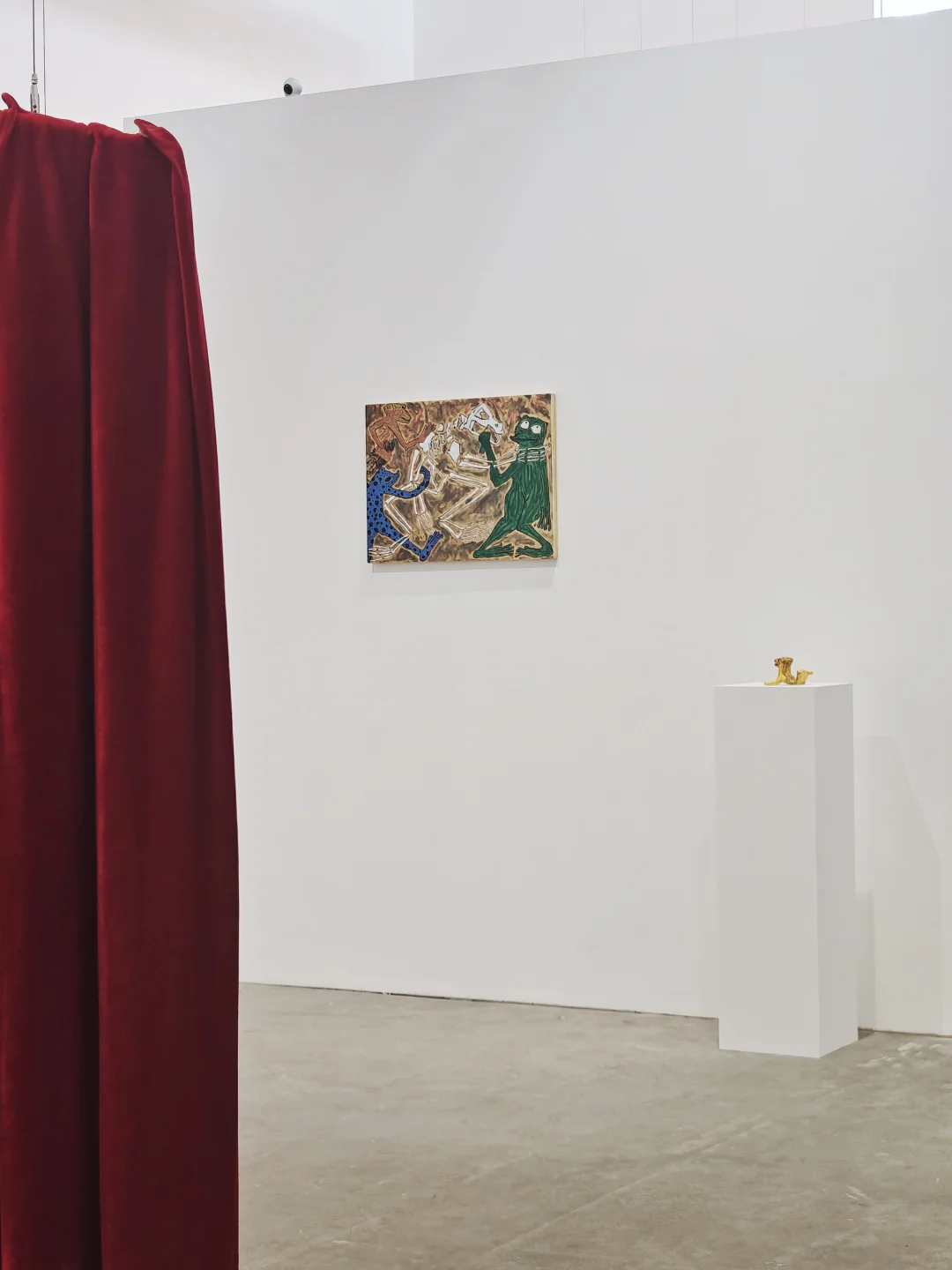 红丝绒幕布和冰冷马蹄铁构建思辨游戏剧场,将想象的发生锚定为物理现场,探讨存在的表演性本质