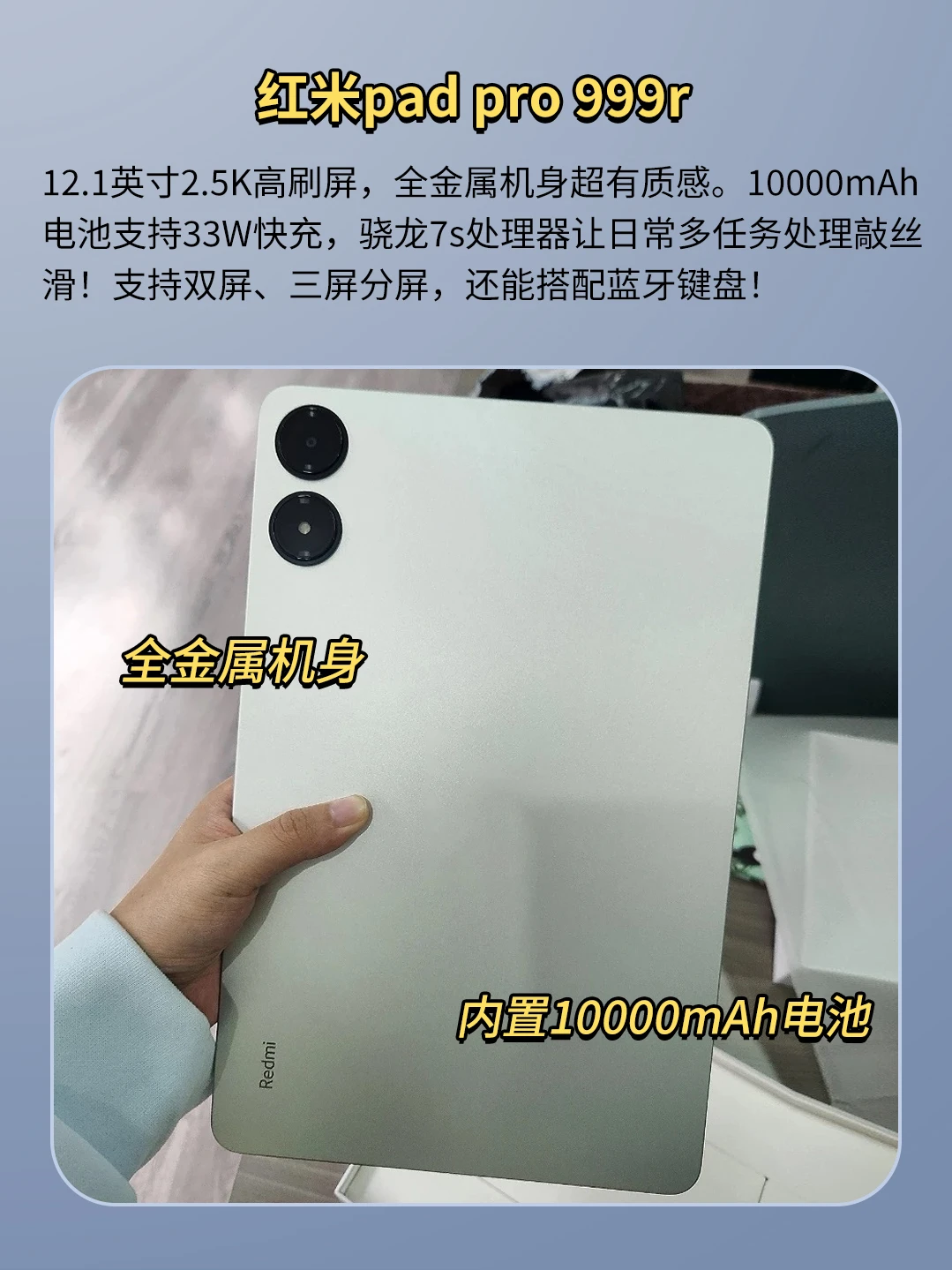 12.1英寸2.5K高刷屏,全金属机身超有质感。10000mAh电池支持33W快充,骁龙7s处理器让日常多任务处理敲丝滑!支持双屏、三屏分屏,还能搭配蓝牙键盘!