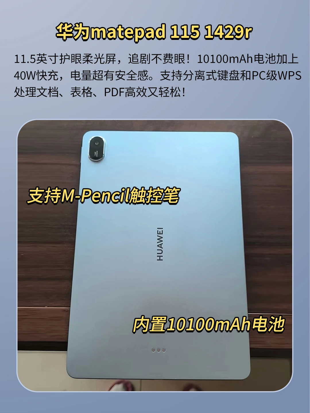 11.5英寸护眼柔光屏,追剧不费眼!10100mAh电池加上40W快充,电量超有安全感。支持分离式键盘和PC级WPS,处理文档、表格、PDF高效又轻松!