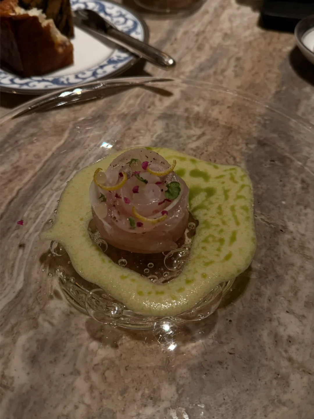 ortensia晚餐品鉴中 之前去吃了他们的芭菲就很不错 晚餐p7的间八鱼印象非常之深刻 紧实的鱼肉咬下去中间还藏着薄薄的爽口又脆的蔬菜类的东西 刚要被一口鱼肉腻到的时候 被一个清爽口感轻薄有柚子香的蔬菜给弹了回来 配上酸奶类的酱汁 一口下去八个情绪