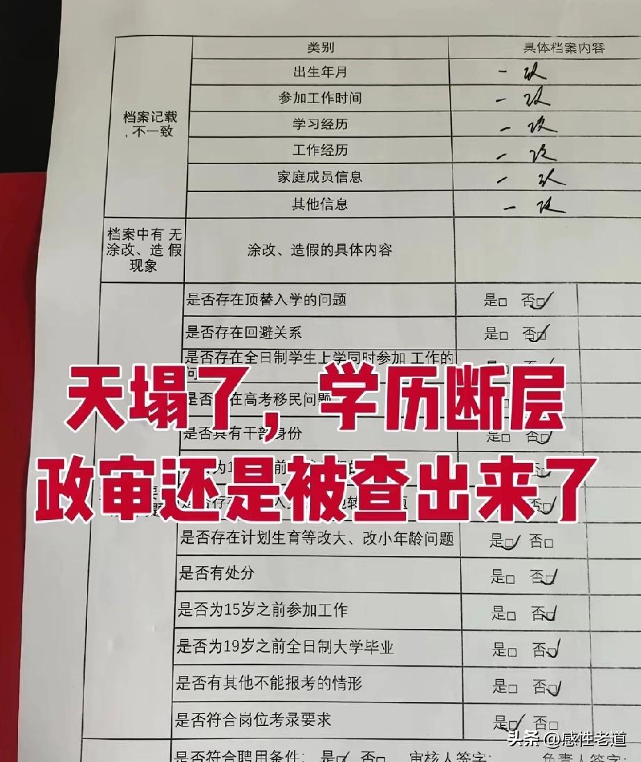 你以为的政审是三代之内包括自己没有违法犯罪记录?实际上的政审比你想的严格的多。很多人提到政审,第一反应就是查自己、查父母、查三代以内有没有违法犯罪记录,只要家人清清白白、自己没有案底,就觉得政审一定能顺利通过。可真正经历过严格政审、真正了解招录规则的人都清楚,现实里的政审,远比大众想象得更细致、更全面、也更严格,它从来不是一张“无犯罪记录证明”就能概括的,而是对一个人从学历、经历、品行到社会关系的全方位核查。 很多人不知道,就连我们容易忽略的学历断层,都是政审中必须严格核实、不容半点含糊的关键事项。政审不会只看你最终拿到的文凭,而是会顺着教育经历一路倒查,从小学、中学到大学,每一段的就读时间、学籍档案、毕业信息、学习经历是否连贯、是否真实、是否符合正常的升学逻辑,都会被一一核对。一旦出现学历断层、档案缺失、经历对不上、学籍信息异常等情况,哪怕本人没有任何违法犯罪行为,也可能直接影响政审结果,甚至被一票否决。这不是故意为难,而是政审必须保证一个人的经历真实、完整、可信,这是最基本的诚信底线,也是岗位可靠性的重要依据。 事实上,政审的考察范围,早已远远超出了“有没有犯罪”这个单一维度。它会深入核查个人的日常品行、征信记录、行政处罚情况、网络言行、政治立场,也会细致了解直系亲属和主要社会关系的现实表现、从业情况、守法状态。不是只有刑事犯罪才会影响结果,一些看似不起眼的行政违规、失信行为、不当言论、档案瑕疵,在严格的政审标准面前,都可能成为无法通过的理由。很多人直到政审环节被卡住,才恍然大悟,原来自己理解的政审,只是最浅层、最基础的一部分,真正的审查,藏在无数容易被忽视的细节里。