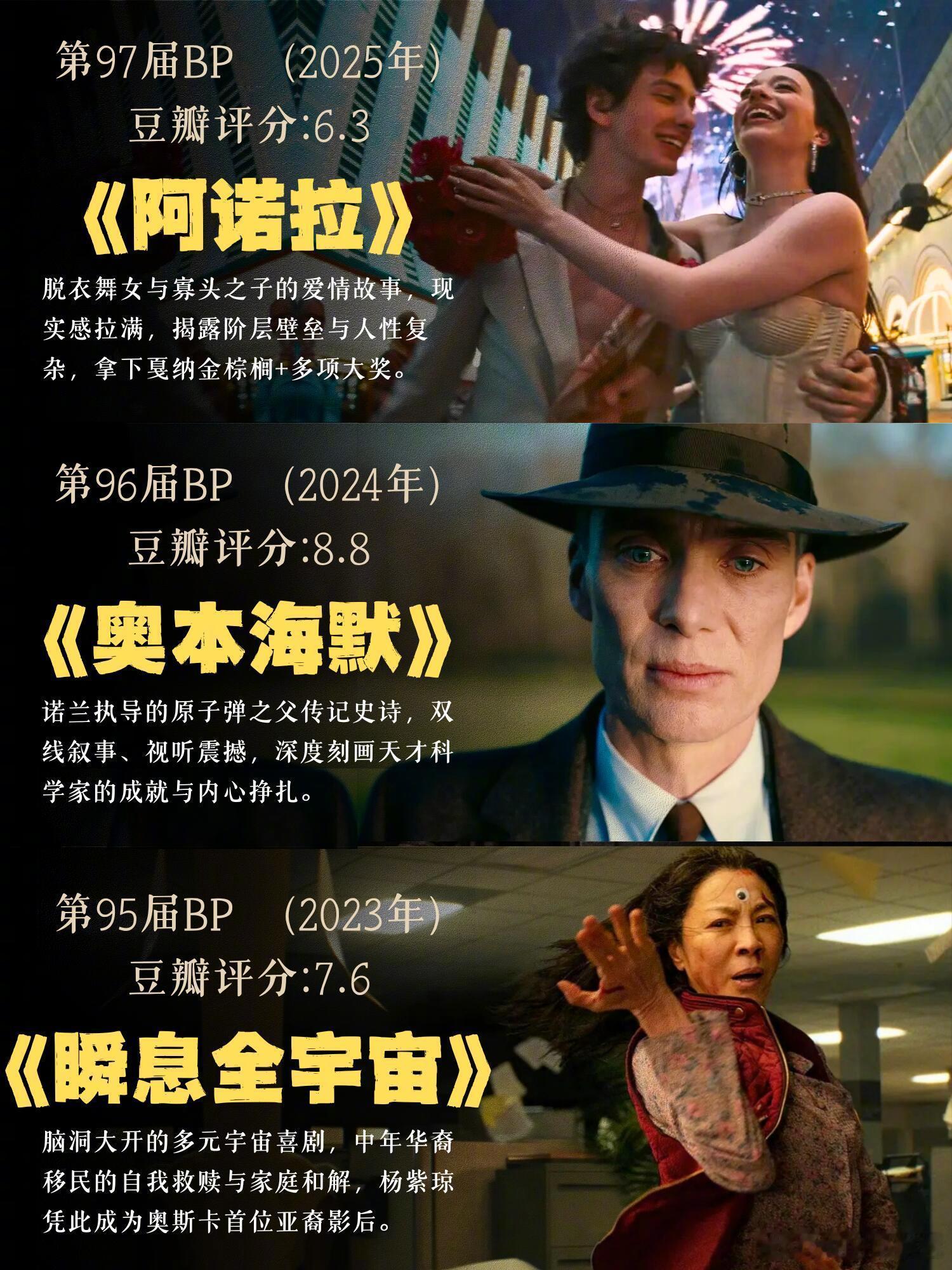 来回顾近九年奥斯卡最佳影片:2017《月光男孩》2018《水形物语》2019《绿皮书》2020《寄生虫》2021《无依之地》2022《健听女孩》2023《瞬息全宇宙》2024《奥本海默》2025《阿诺拉》