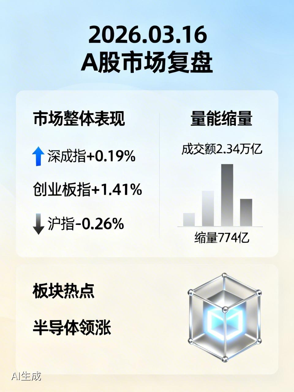 2026年3月16日A股市场复盘 一、市场整体表现 1. 三大指数分化: 沪指收跌0.26%报4084.79点, 深成指微涨0.19%报14307.58点, 创业板指表现较强,大涨1.41%报3357.02点。 2. 量能缩量: 沪深京三市成交额约2.34万亿元, 较上一交易日缩量774亿元, 显示市场观望情绪有所升温。 二、板块热点分析 1. 半导体板块领涨:半导体概念、国产芯片、存储芯片等细分方向表现活跃,成为市场核心热点。其中,存储芯片板块涨幅达2.89%,亚翔集成、朗科科技等个股涨停。 2. 其他活跃板块:渔业、元件、航运港口、广告营销、白酒等板块涨幅居前,其中渔业板块大涨3.83%,白酒板块实现21家个股上涨且无一跌停,表现强势。 3. 调整板块:贵金属、钢铁、煤炭、稀土、农化制品等板块跌幅居前,显示资源类周期股短期承压。 三、资金动向 1. 主力资金流入:半导体板块以63.7亿元的主力净流入额位居首位,其次是元件(25.3亿元)和乘用车(20.5亿元),显示资金聚焦科技成长方向。 2. 概念轮动特征:央国企改革概念连续多日位居涨停数榜首,托育服务、纳米银等新晋概念也表现活跃,反映市场热点切换频繁。 四、市场风格与趋势 1. 结构性行情延续:创业板指明显强于主板,半导体等成长板块获得资金青睐,而传统周期板块则出现调整,市场呈现“轻大盘、重个股”的特征。 2. 热点轮动加速:从近期数据看,每日领涨板块变化较快,如前期活跃的风电设备、煤炭开采等今日表现平淡,投资者需注意节奏把握。 五、总结 今日A股市场呈现“指数分化、结构活跃”的格局,半导体板块成为最强主线,资金明显向科技成长方向聚集。 量能小幅缩量或暗示短期多空分歧加大,后续需关注成交量能否重新放大以及热点板块的持续性。