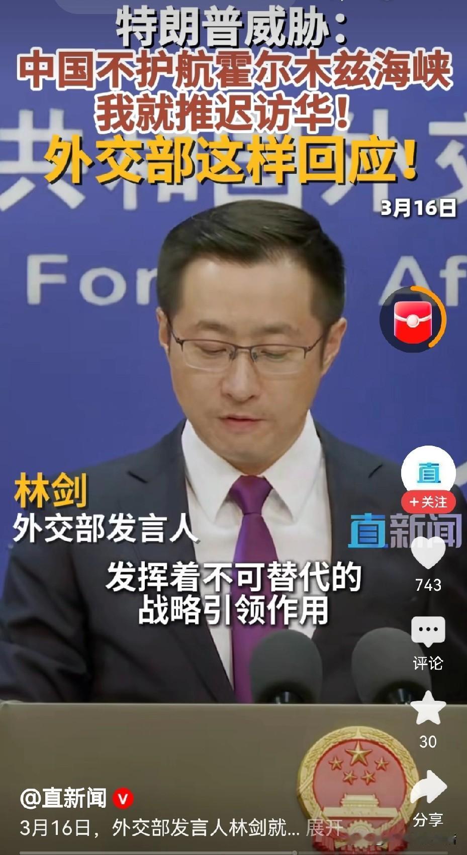 难道真的是因为中国不参加霍尔木兹海峡的护航活动,特朗普才推迟访华活动吗? 霍尔木兹海峡的护航不是五角大楼对外说他们会保障大家的安全吗?泰国的水手还真相信他们的话,结果船给炸了。 林剑这个回答堪称完美,什么都没说,又什么都说了,两个国家的访问这事非常重要,但是这是两个国家共同商定的时间和议程,不是那一方想什么时候来什么时候就可以来访问,一定要经过我们同意才行。 现在特朗普的话越来越随心所欲了,想到哪里就说到哪里,看看还有几个人会再相信他的话。