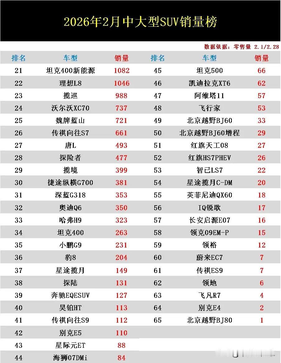 又是大胜!刚看了2026年2月中大型SUV销量排行榜,给人的第一印象就是市场竞争格局已大变天了,在榜单前二十名里面清一色的国产新能源车型,尤其在榜单前十名里面国产车的统治力更为强悍,成功包揽了九个席位。而传统合资品牌风光已不再了,仅宝马X5勉强守住第5名的位置,途昂、普拉多排名分别掉到了第14和第20名,销量均在急剧萎缩。第一名小米YU7、第二名理想i6、第三名钛7,第四名问界M7!