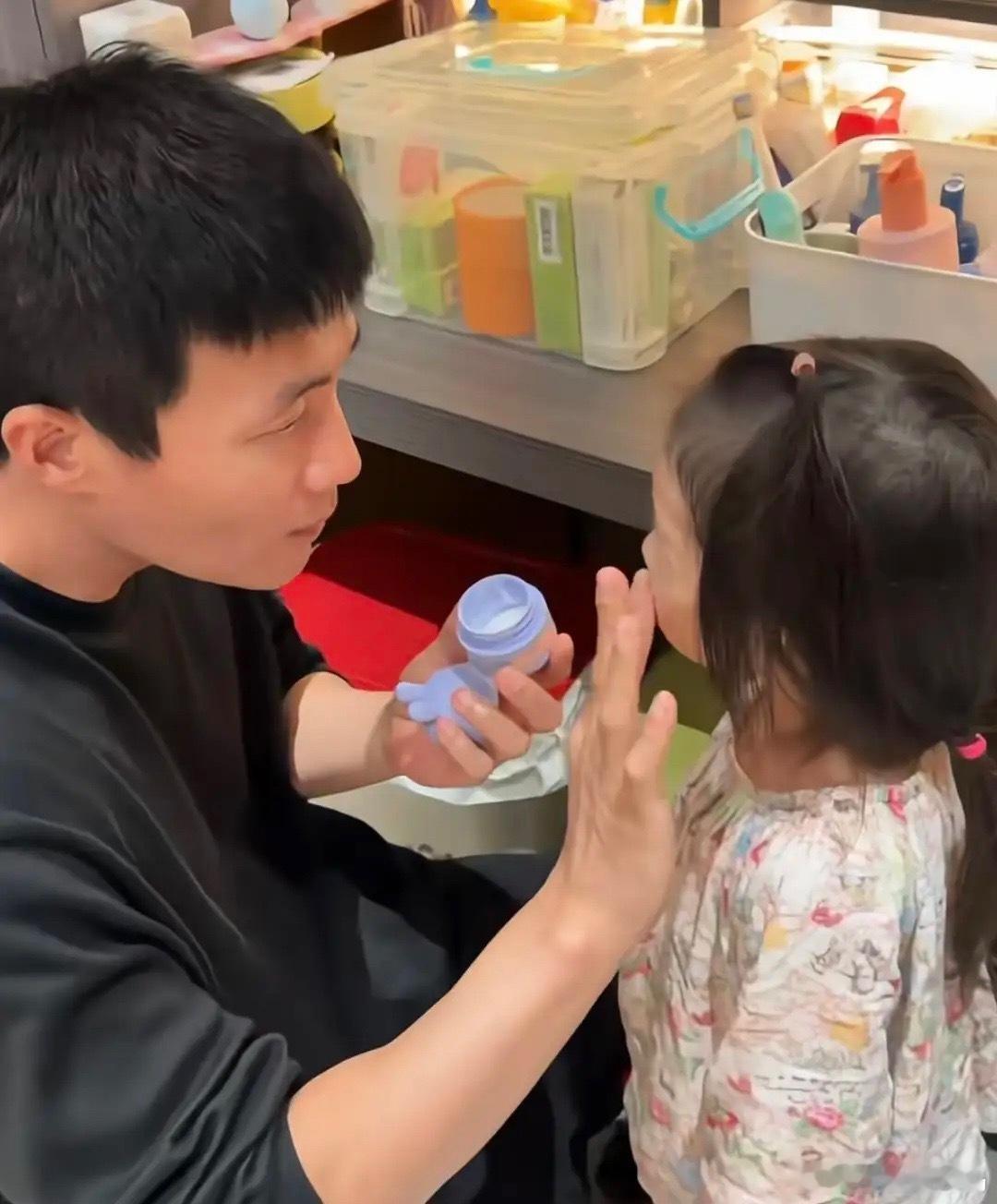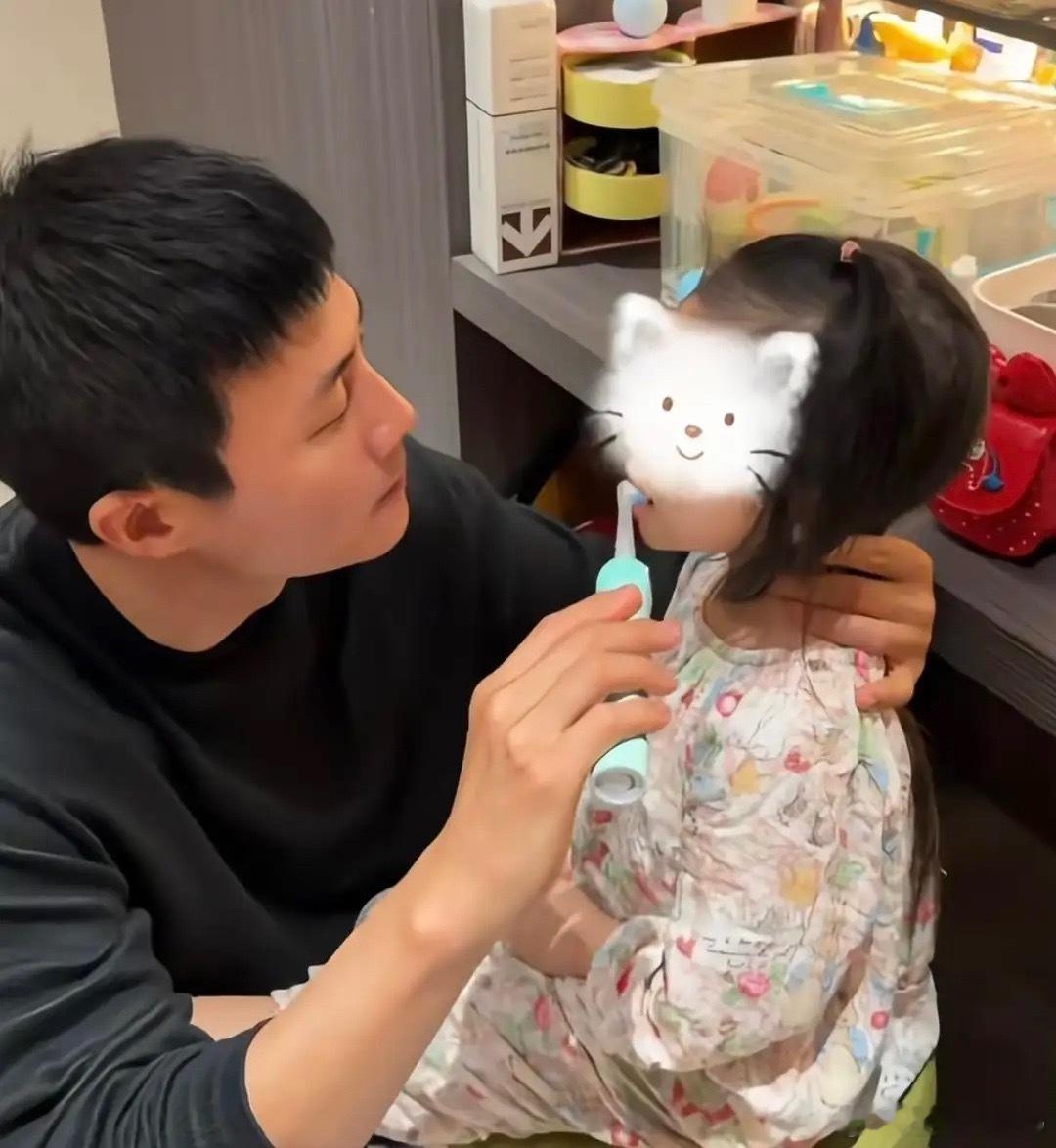 王灿晒老公照顾孩子,杜淳晚上帮4岁女儿刷牙,给孩子洗脸,抹面霜,全程蹲着哄女儿,